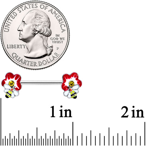 Let your nipple piercings feel like queen bees with this 14 gauge nipple jewelry. It's made with 14mm durable 316L surgical grade stainless steel straight barbells. Each of the ends features a flower charm with red and white petals and a yellow gem center. The flower is embellished with a queen bee perched on it, indentifiable by the red dot on her back. Feel like the queen of the hive with these charming floral nipple piercing rings! Sold as a set of two.