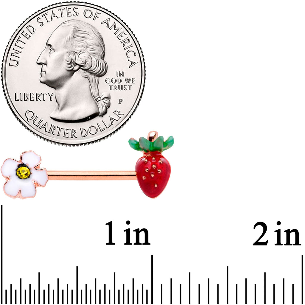 Oooh, this 14 gauge nipple jewelry is going to look berry nice in your piercings! It's made with 14mm rose gold tone plated over 316L surgical grade stainless steel straight barbells. One end features a white flower embellished with a yellow gem at its center for extra contrast and visual interest. The other end is a luscious red strawberry with carefully crafted green leaves for extra realism. These nipple rings are sure to look sweet on you! Sold as a set of two.Specifications
