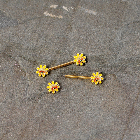 This 14 gauge nipple jewelry will have you thinking of sunshine and other sweet things....like honey! It's made with 14mm gold tone PVD over 316L surgical grade stainless steel straight barbells. The ends each feature a yellow flower charm with stylized petals. Taking a moment to pollinate them is a tiny bee, perched on one side. The bee features black and yellow detailing and dark red embellishment on the wings to really make him stand out. These sweet summery nipple rings will be sure to put you in a sunny mood! Sold as a set of two.Specifications