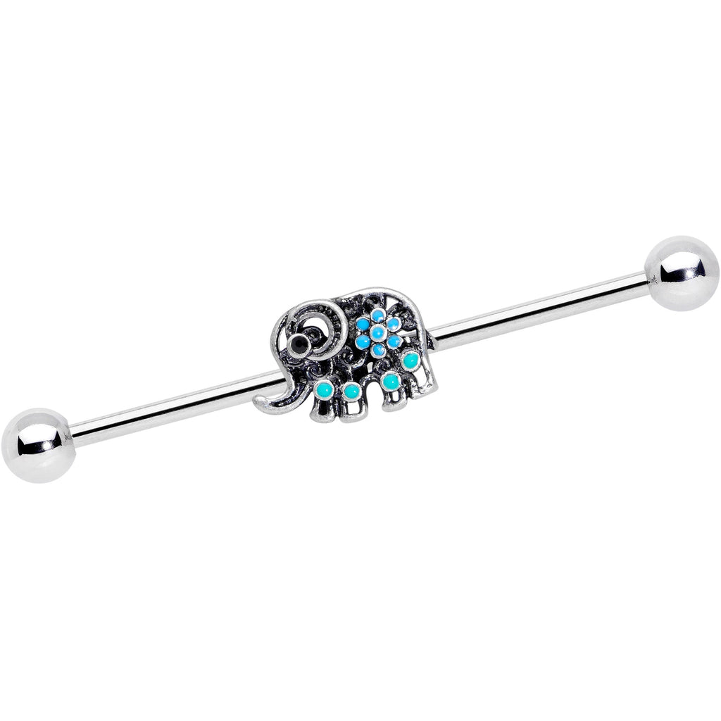This elephant wants to bring its curvy and colorful style to your industrial piercing on this 14 gauge helix barbell! It's made with a 1 1/2" durable 316L surgical grade stainless steel straight barbell with 5mm ball ends. It features our adorable elephant charm with rounded lines, curled trunk and circular ears. The elephant is further embellished with aqua color orbs for a lovely splash of color. Best of all, this elephant can slide up and down the barbell so you exactly the look you want. They say that elephants never forget and you're sure to remember this colorful curvy elephant industrial jewelry!Specifications