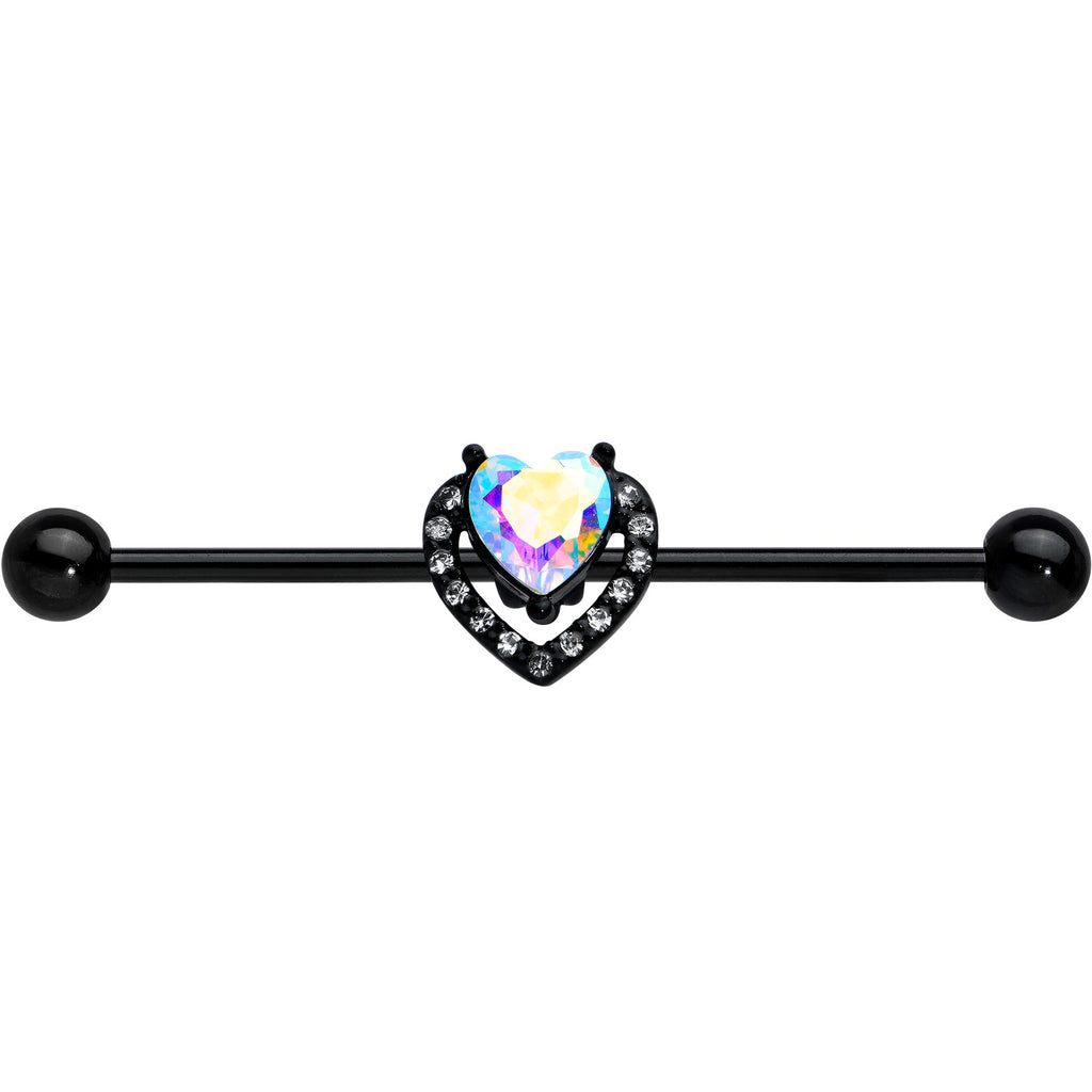 14 Gauge Aurora Clear Gem Black Rococo Heart Industrial Barbell 38mm