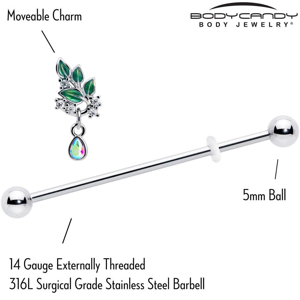 14 Gauge Aurora CZ Gem Morning Leaves Dangle Industrial Barbell 38mm