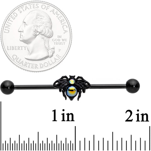 This bee has a lot to get done, but it still wants to be sure it looks good doing it all! The 14 gauge industrial earring is made with a 1 1/2" black PVD over 316L surgical grade stainless steel straight barbell and has 5mm ball ends. The bee charm is set with an aurora color orb for its abdomen, to match the aurora gem at its thorax. It has lacy openwork wings and distinct individual legs for extra detailing that really makes this jewelry stand out. And because the bee has things to do, it is moveable and be slid up and down the length of the barbell so you can get just the look you want. Once you've got this busy bee in your piercing, you'll be busy too....fending off compliments!Specifications