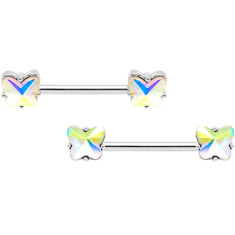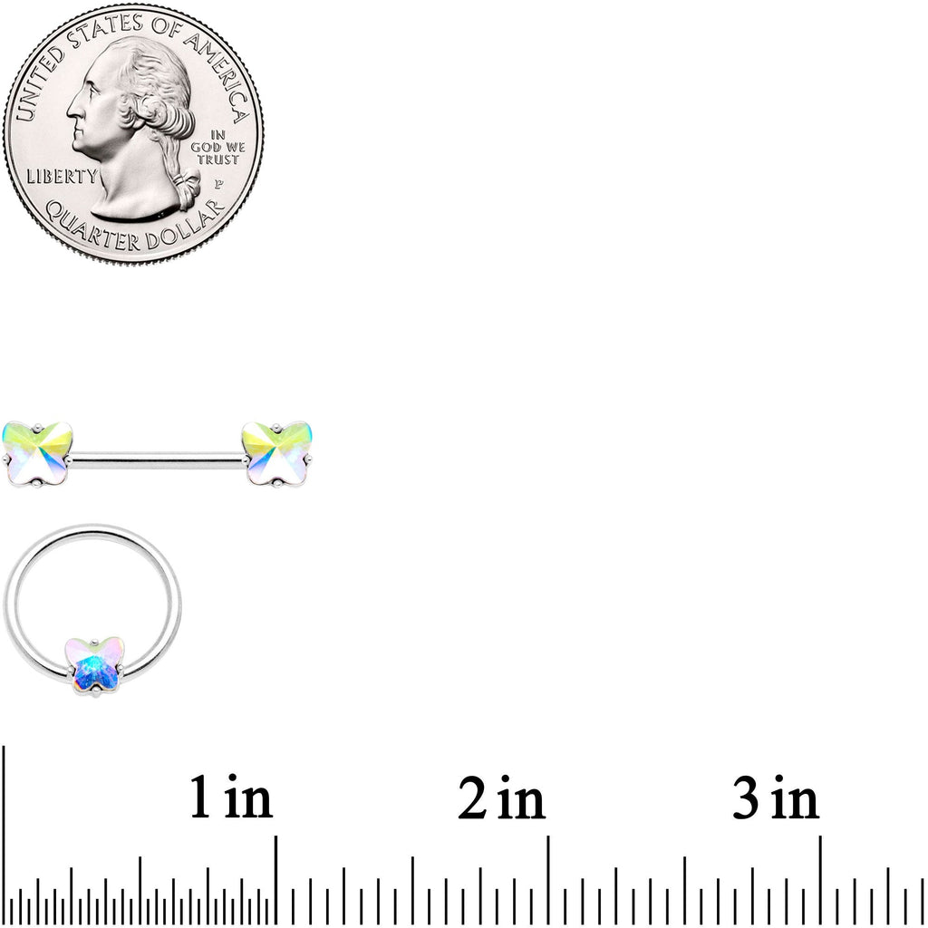 Don't fly away, little butterflies! You're too pretty to let go of this set of 14 gauge nipple rings! There are aurora butterfly shaped gems on the tips of 14mm durable 316L surgical grade stainless steel straight barbells. There's also a pair of 8mm captive rings clasping matching aurora butterfly shaped gems. Those are also made with durable 316L surgical grade stainless steel circular rings. With so many options, you'll feel like your piercings have gone from ordinary to extraordinary - just like a butterfly! Sold as a set of four.Specifications