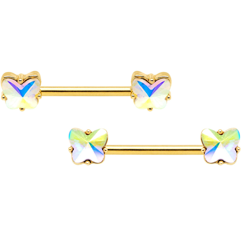Don't fly away, little butterflies! You're too pretty to let go of this set of 14 gauge nipple rings! There are aurora color butterfly shaped gems on the tips of 14mm gold tone plated over durable 316L surgical grade stainless steel straight barbells. There's also a pair of 8mm captive rings clasping matching aurora color butterfly shaped gems. Those are also made with gold tone plated over durable 316L surgical grade stainless steel circular rings. With so many options, you'll feel like your piercings have gone from ordinary to extraordinary - just like a butterfly! Sold as a set of four.Specifications