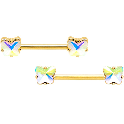 9/16" 5/16" Aurora Gem Butterfly Gold Tone BCR Barbell Nipple Ring Set