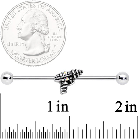 Are they shrink rays? Are they teleporter beams? This 14 gauge industrial earring will zap your look with a big dose of futuristic style! It's made with a 1 1/2" durable 316L surgical grade stainless steel straight barbell and has 5mm ball ends. It features a charm of a mysterious, ultra-modern looking raygun. The body is embellished with tiny aurora gems that really catch the eye and keep it from being overwhelmed by all the intricate detailing. And you can slide it up and down the length of the barbell to get just the look you're after! This industrial barbell is bound to leave your inner space traveler beaming with joy!Specifications