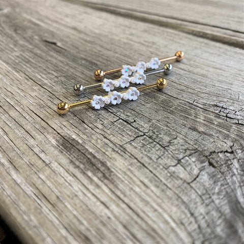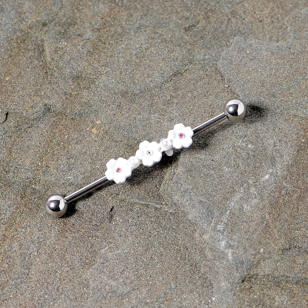 If you're looking for something fun and floral to shake off weary winter then you will love this 14 gauge industrial jewelry with tons of spring style! Made with a 1 1/2" durable 316L surgical grade stainless steel straight barbell, this industrial earring features a moveable white flower charm set with white orbs and aurora gems that will always look as fresh as a spring morning!Specifications