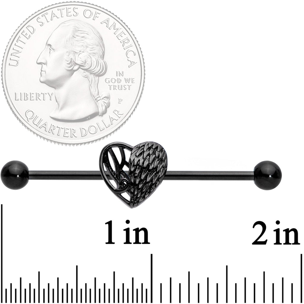 This 14 gauge industrial earring is bound to make your heart soar to the heavens! It's made with a 1 1/2" black PVD over 316L surgical grade stainless steel straight barbell with 5mm ball ends. It features a three-dimensional heart with the front half composed of an angel's wing, with textured engraved detailing of each feather. The rest of the heart is open worked for a light airy feel, and an appearance reminiscent of a butterfly's wings. And the heart can be slid up and down the length of the barbell so you get just the look you want! Between the fine detailing and the rich color, this double helix earring is just.....heavenly!Specifications