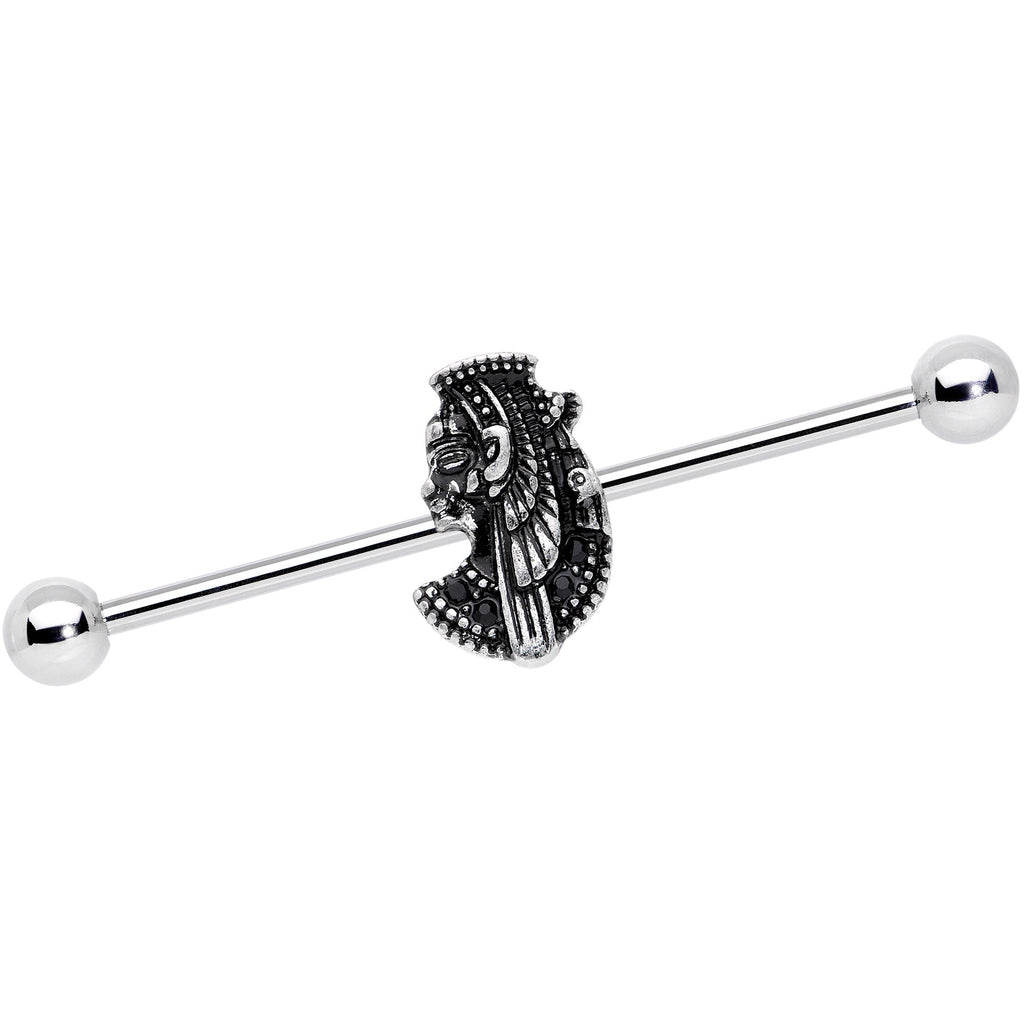 The famed queen Cleopatra has returned to our era and she's brought along the god Anubis as well on this 14 gauge helix barbell. It's made with a 1 1/2" durable 316L surgical grade stainless steel straight barbell with 5mm ball ends. It features a Cleopatra charm with black gems. Hidden in the folds of her robe lurks the jackal god Anubis, lord of the dead. The Egyptian themed charm can be slid up and down the length of the barbell industrial so you can get just the look you want. This industrial earring is sure to make you look like royalty!