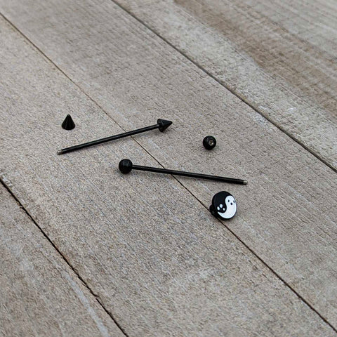 Together the ghosts on this 14 gauge Halloween helix barbell make up the jewelry universe! This 1 1/2" industrial jewelry is made with black PVD over 316L surgical grade stainless steel straight barbells. One features black cone ends for an edgy, punk-styled look. The other features a yin-yang charm, composed of a pair of ghosts in black and white. You can even slide the charm up and down the length of the barbell for the perfect look! Get your industrial earrings for Halloween with the spiritual spirits on this barbell earring! Sold as a set of two.Specifications