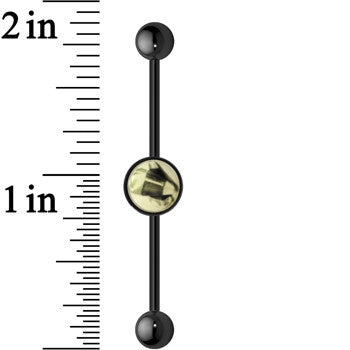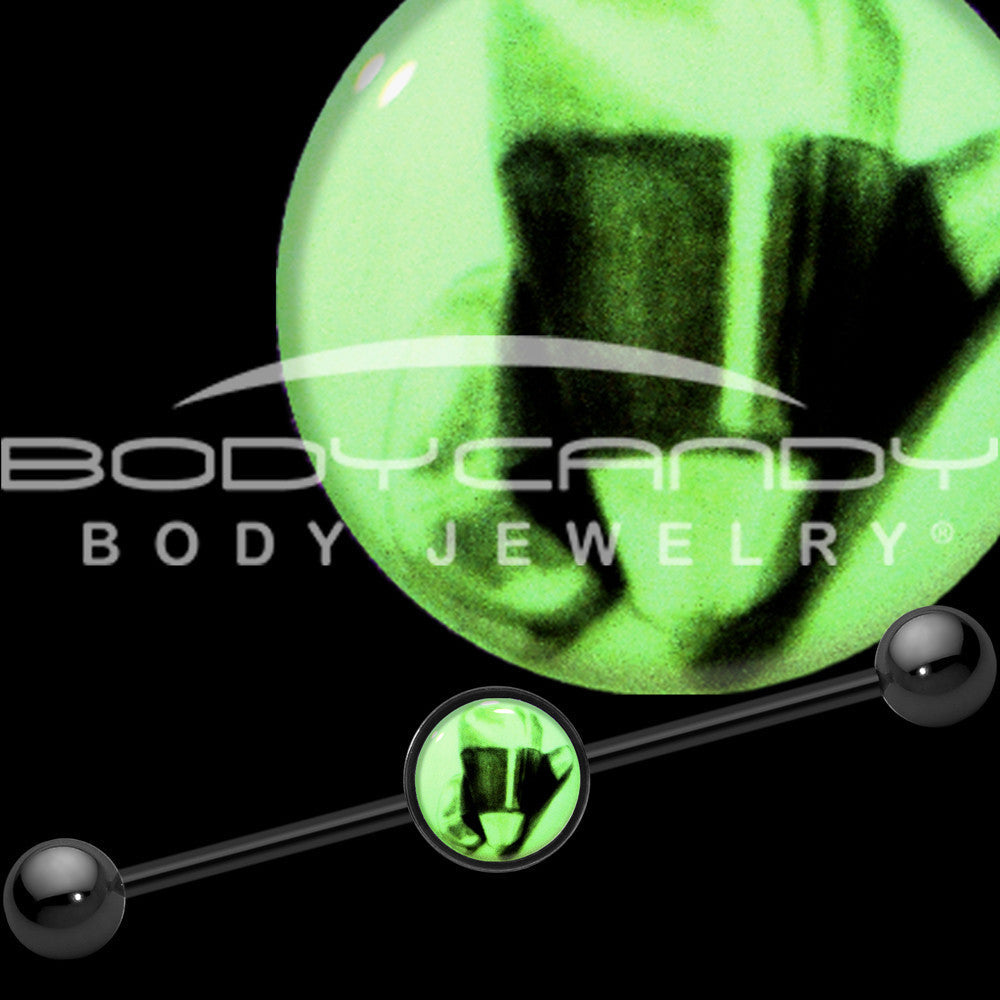 Show off your interest in all things Halloween scary when you wear this helix barbell. Made with a 1.45" black anodized titanium over surgical grade stainless steel straight barbell, this helix jewelry features a nonmoving, glow in the dark black classic candy corn on a black background logo inlay. If you're ready for something spooky you will love this industrial barbell.