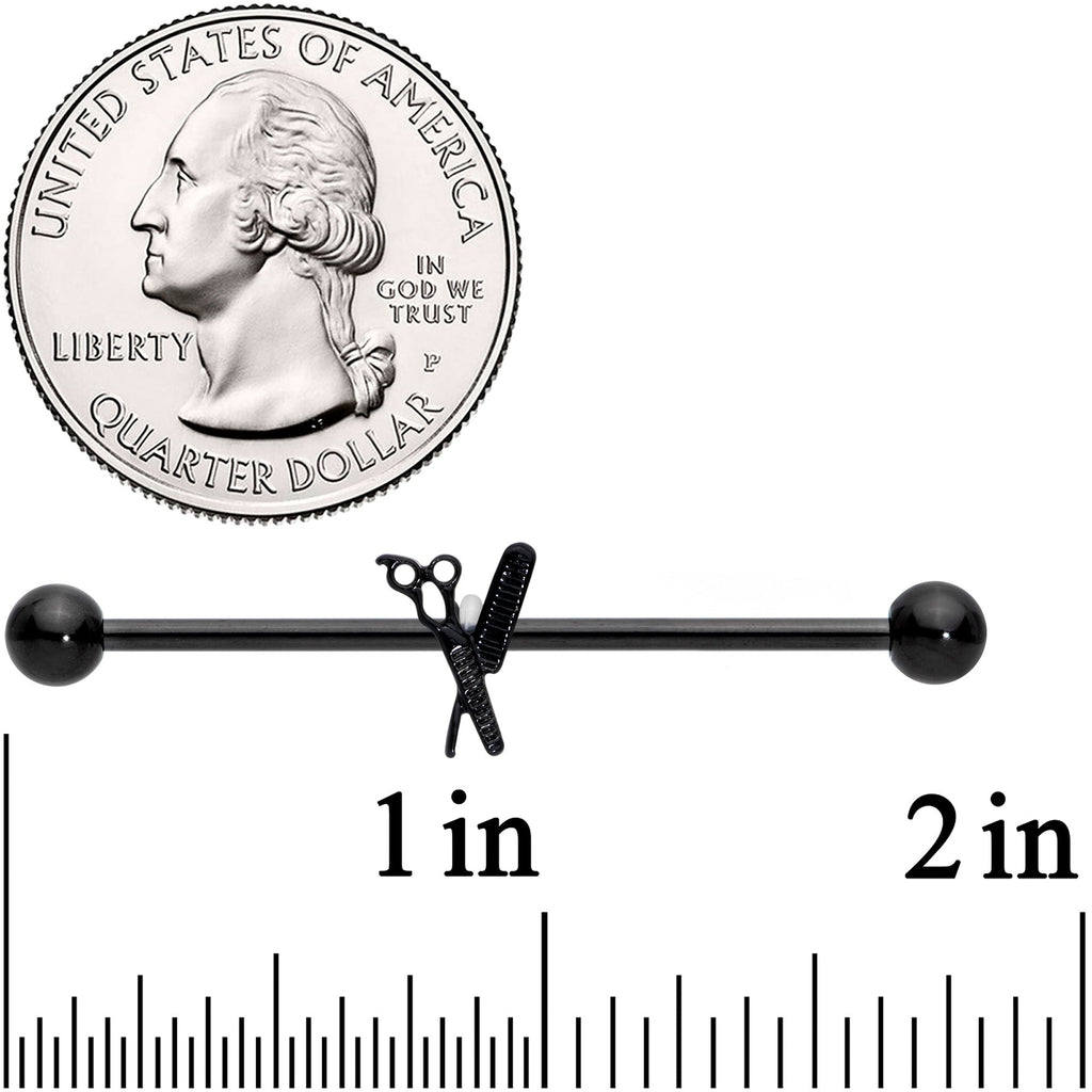 No need to trim your style with this 14 gauge helix barbell! It's made with a 1 1/2" black electroplated over 316L surgical grade stainless steel straight barbell with 5mm ball ends. It features a charm of a pair of barber's scissors charm crossed with a comb. It's carefully detailed to give the look of a silhouette and an antique barbershop style and you can slide it up and down the length of the barbell to get just the look you want. If you're a hairdresser or looking for whimsical jewelry for your industrial piercing, hair's exactly what you're looking for!Specifications