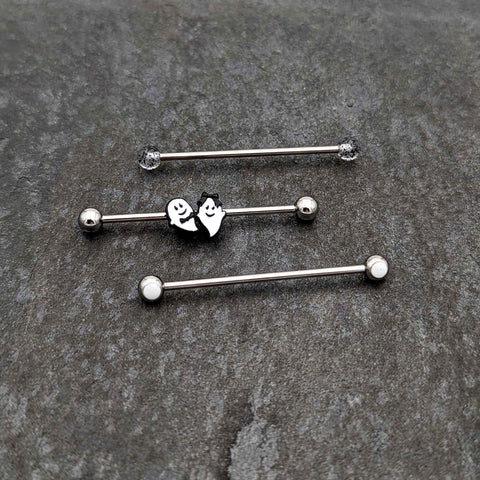 Get all decked up and head out on the town with this set of 14 gauge helix barbells! They're made with 1 1/2" durable 316L surgical grade stainless steel straight barbells. One features a simple, unadorned style with 5mm ball ends. The second one features 5mm clear acrylic ball ends, with black glitter set inside for a subtly stylish look. The third one features a ghost charm, with a pair of ghosts in black tie finery. They even glow in the dark and you can slide them up and down the length of the barbell for the perfect look! Get ready to look as glam as the ghosts on these Halloween barbell earrings! Sold as a set of three.Specifications
