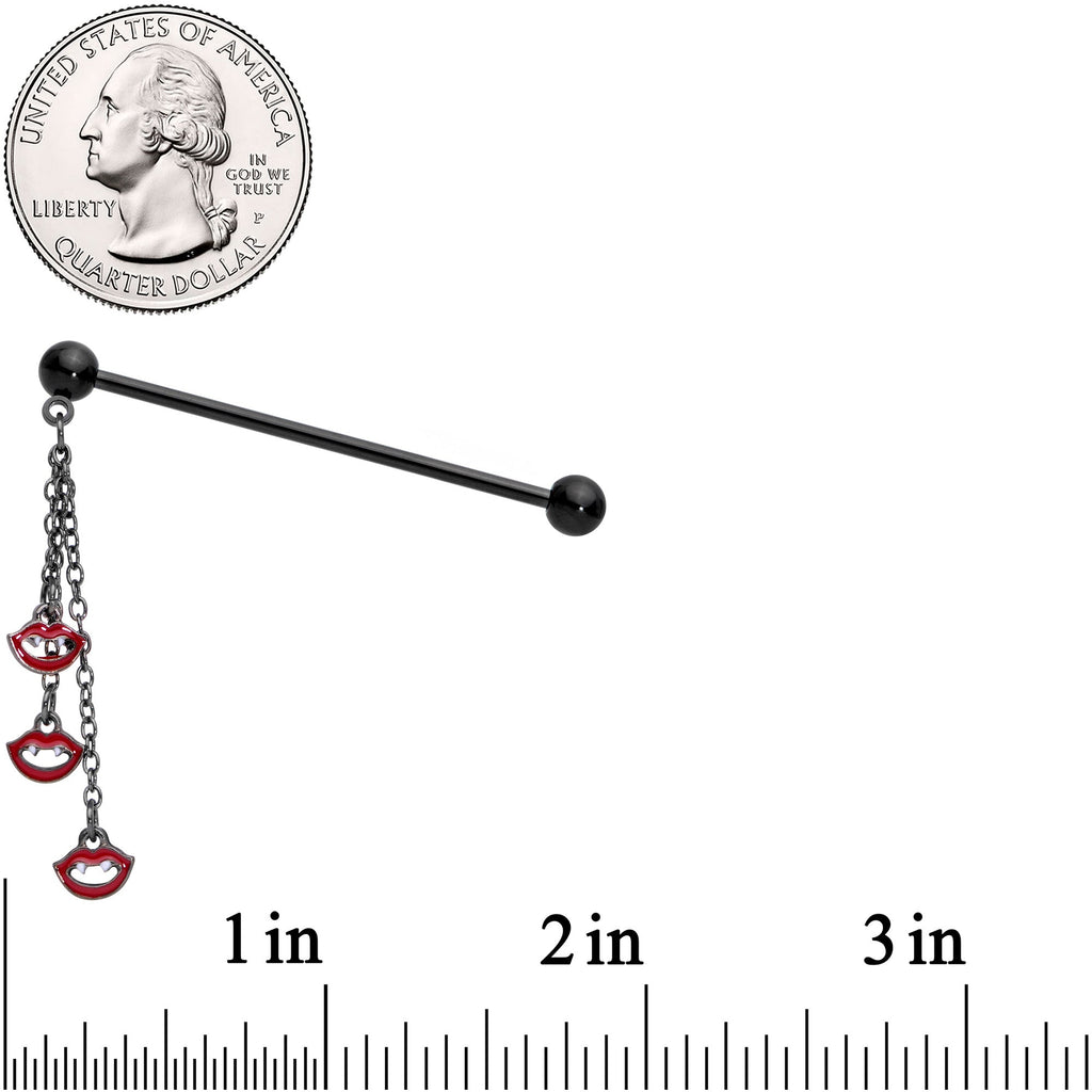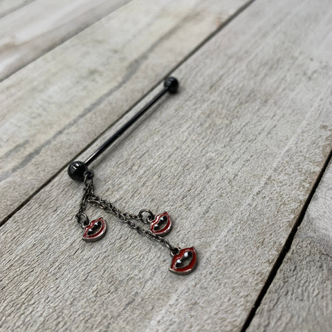 This Halloween, take a bite out of style with this 14 gauge helix barbell! It's made with a 1 1/2" black plated over 316L surgical grade stainless steel straight barbell with 5mm ends. Dangling beneath one of the ball ends is a trio of matching black chains, each with a charm of a fanged mouth at the end. Vamp up your look with this sexy, scary, vampire themed industrial piercing jewelry!Specifications