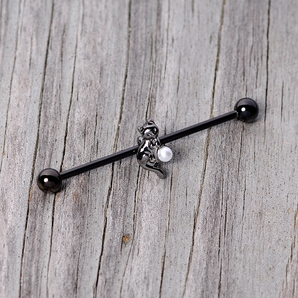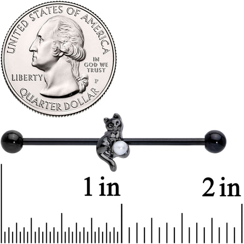 Get ready for the Halloween holiday with this black cat 14 gauge industrial jewelry. Made with a 1 1/2" black plated over 316L surgical grade stainless steel straight barbell, this industrial piercing features a moveable black cat charm set with black gems and a white orb that resembles a ball of yarn.Specifications