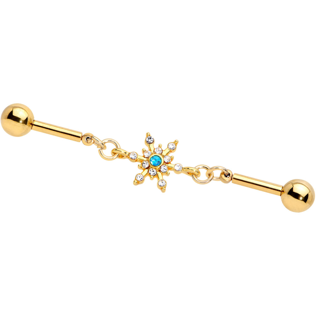 14 Gauge Blue CZ Gem Gold Hue Snowflake Double Industrial Barbell 38mm