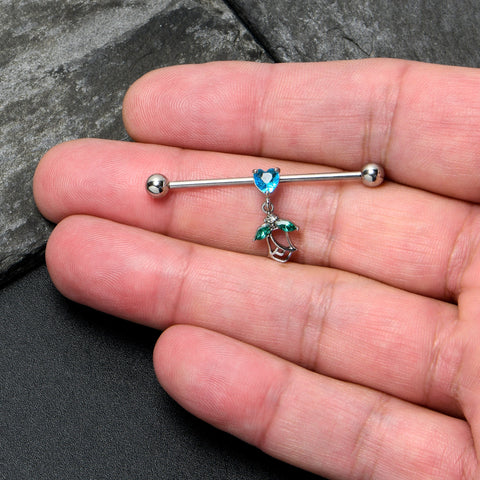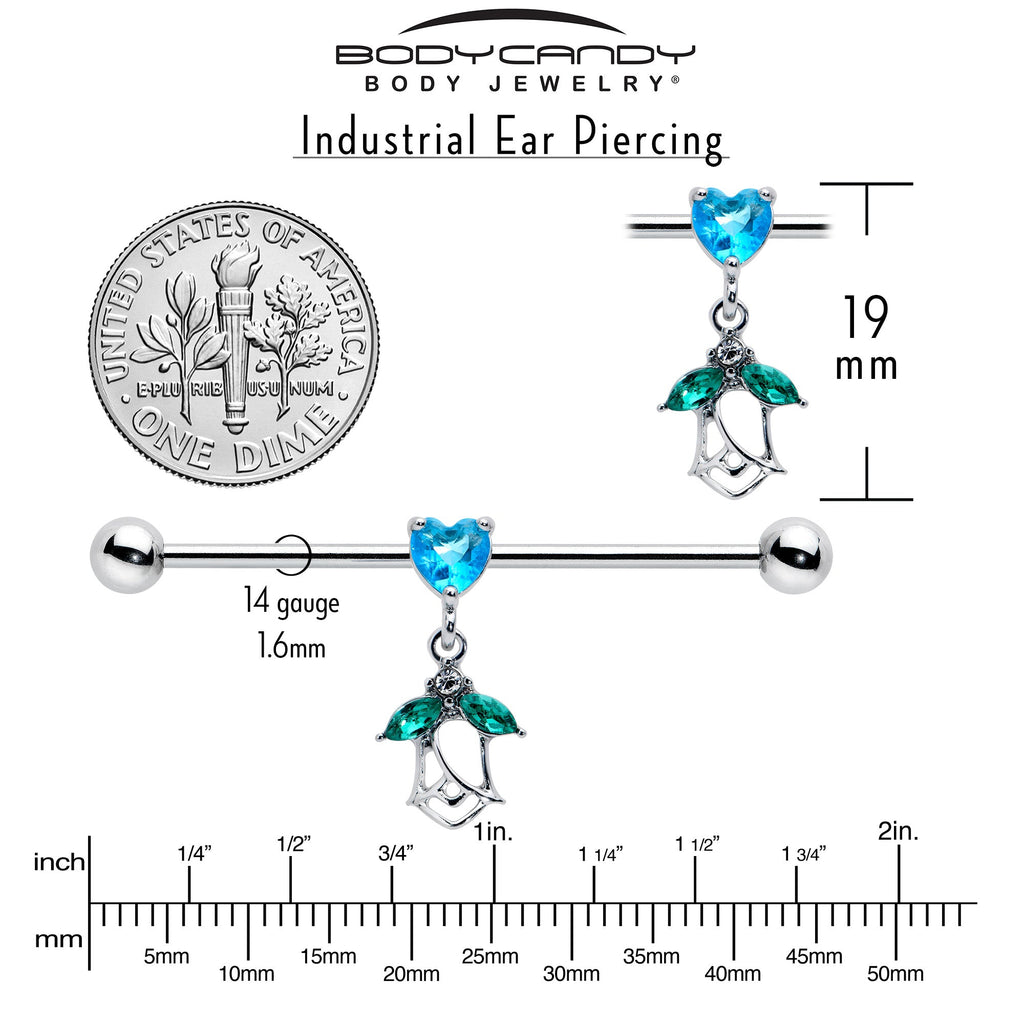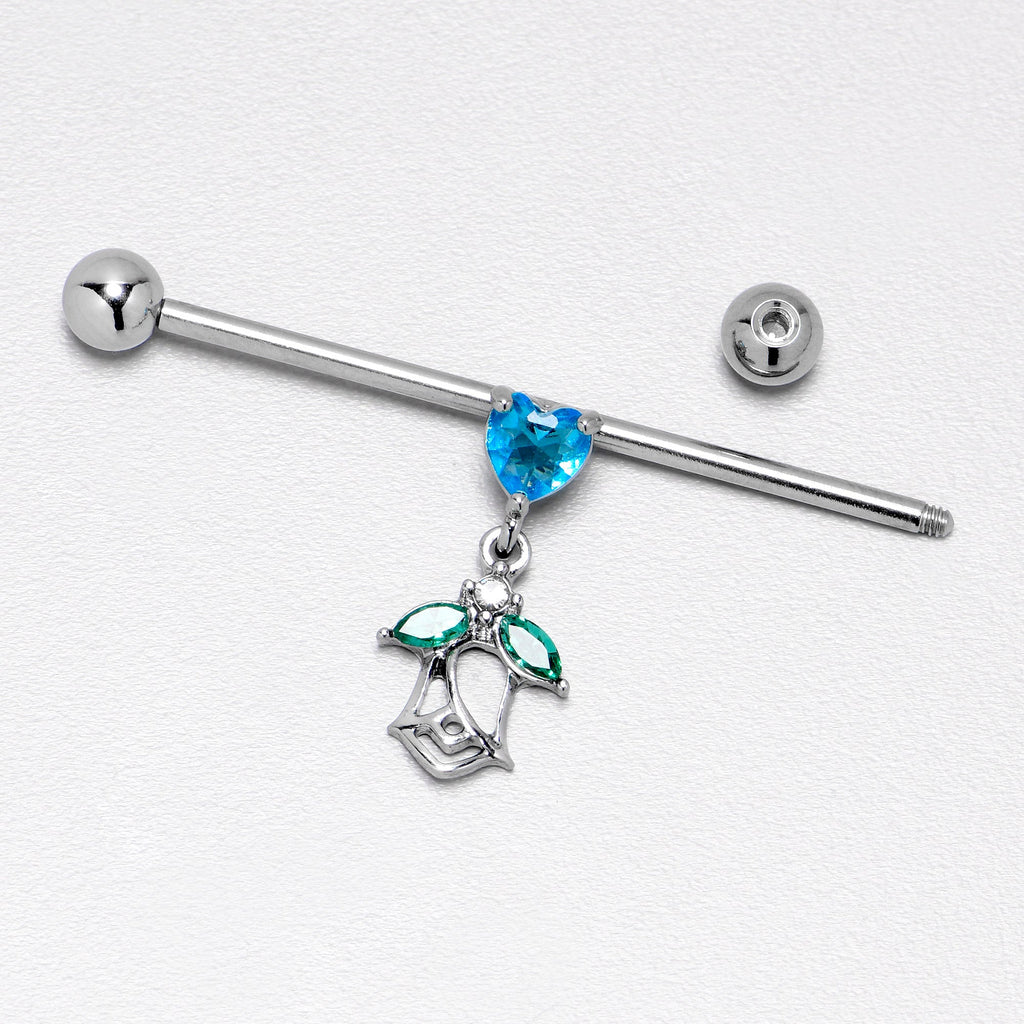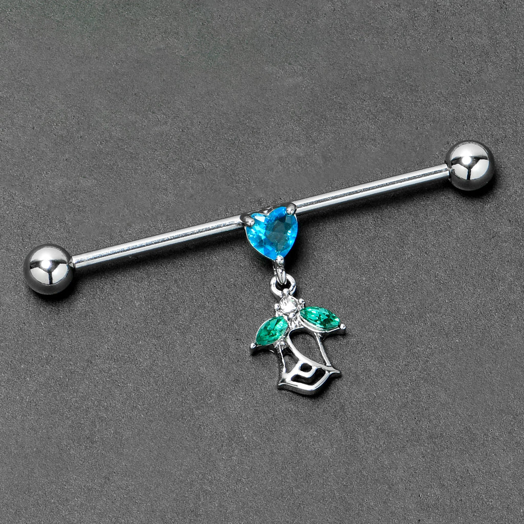 14G Blue CZ Gem Heart And Rose Dangle Industrial Barbell 38mm