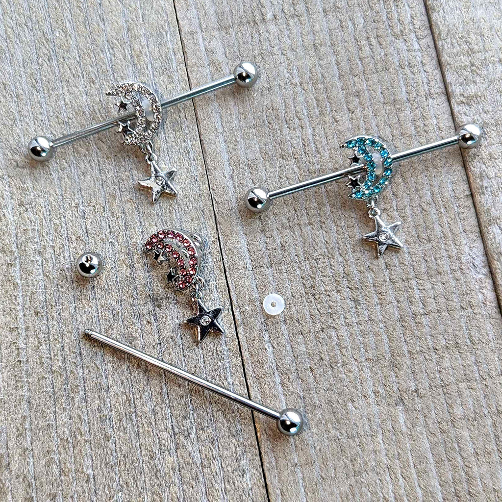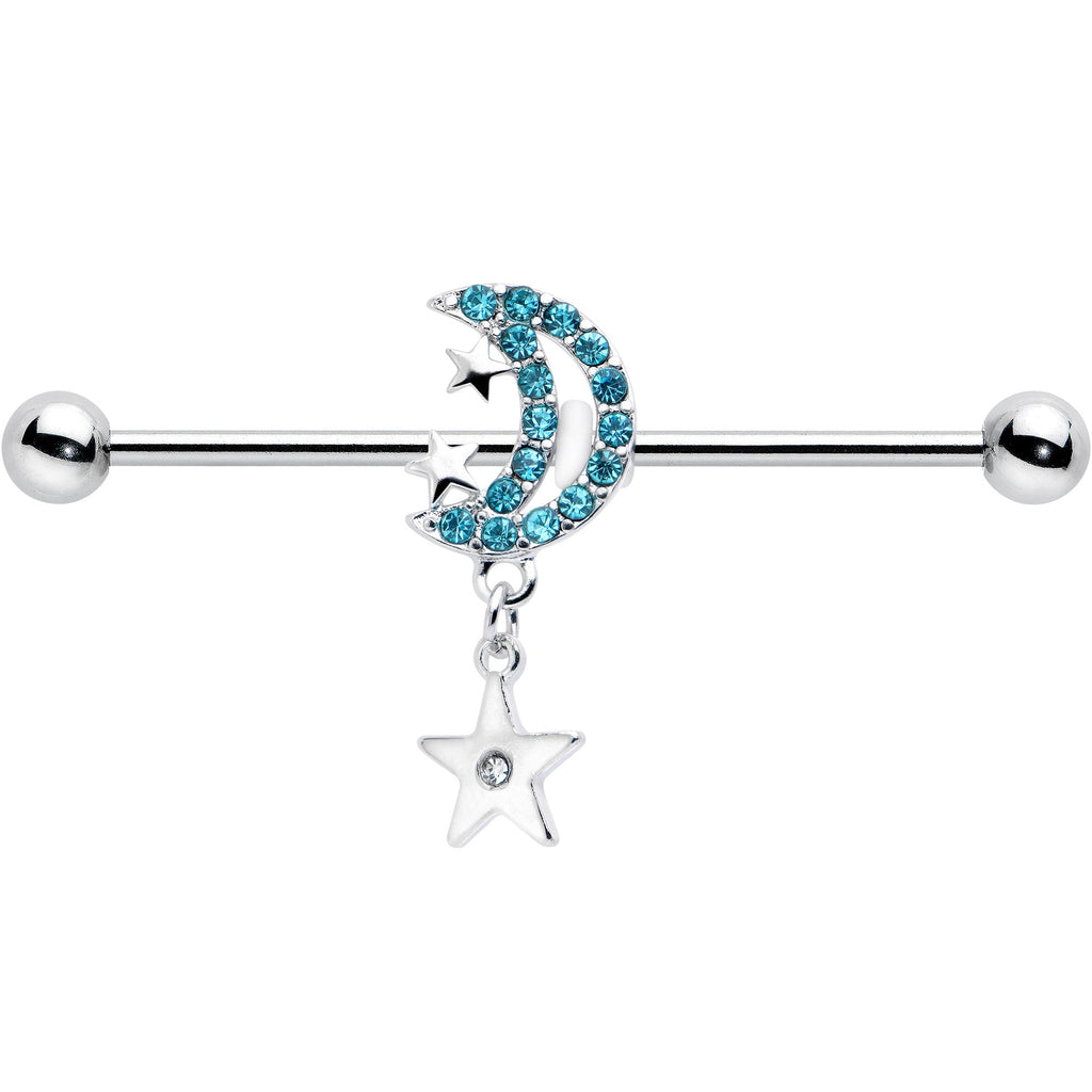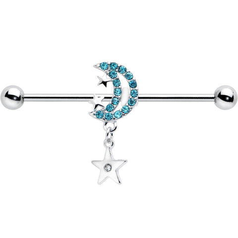14 Gauge Blue CZ Gem Moon Dangle Star Industrial Barbell 38mm