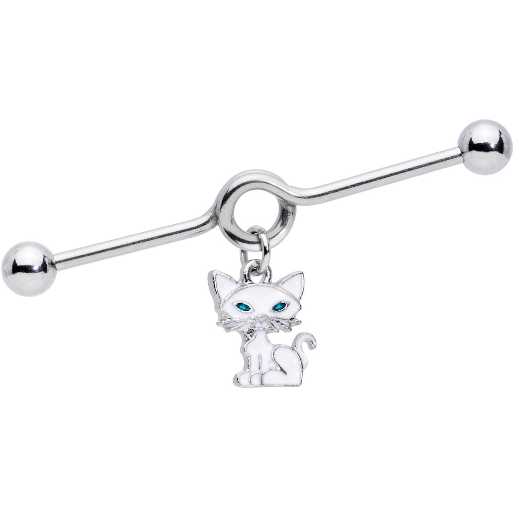 The pretty kitty on this 14 gauge helix barbell is sure to make you purr! It's made with a 1 1/2" durable 316L surgical grade stainless steel project barbell with 5mm ball ends. The barbell has a large loop in the center. Dangling beneath it is a white cat charm, with pale blue eyes for a truly striking color contrast. Add some feline fun to your industrial piercing with this charming cat barbell earring!Specifications