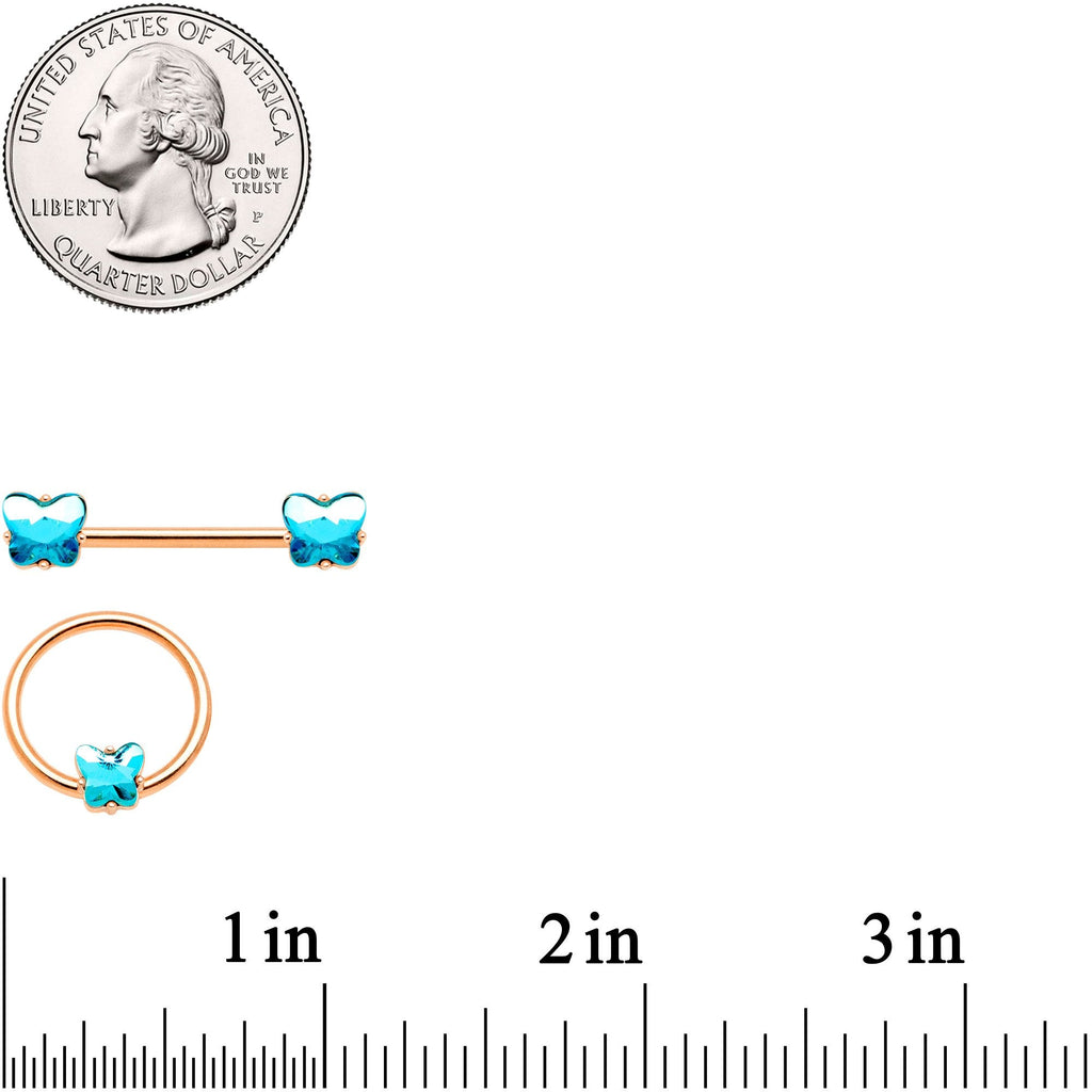 Don't fly away, little butterflies! You're too pretty to let go of this set of 14 gauge nipple rings! There are blue butterfly shaped gems on the tips of 16mm rose gold tone over durable 316L surgical grade stainless steel straight barbells. There's also a pair of 12mm captive rings clasping matching blue butterfly shaped gems. Those are also made with rose gold tone over durable 316L surgical grade stainless steel circular rings. With so many options, you'll feel like your piercings have gone from ordinary to extraordinary - just like a butterfly! Sold as a set of four.Specifications