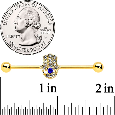 14 Gauge Blue Gem Gold Tone Hamsa Hand Eye Industrial Barbell 38mm