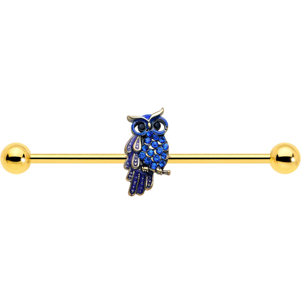 14 Gauge Blue Gem Gold Tone Sky Owl Industrial Barbell 38mm