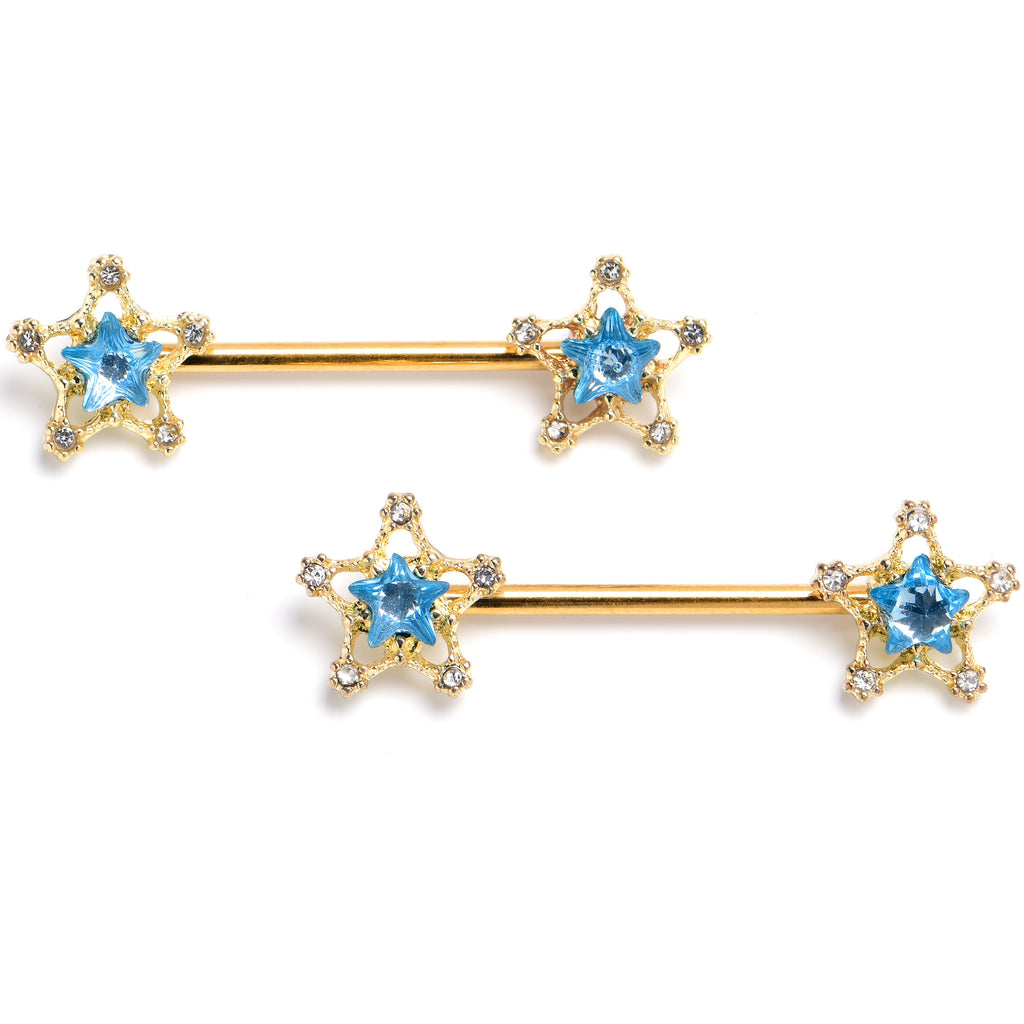 14 Gauge Blue Gem Gold Tone Starry Glam Barbell Nipple Ring Set
