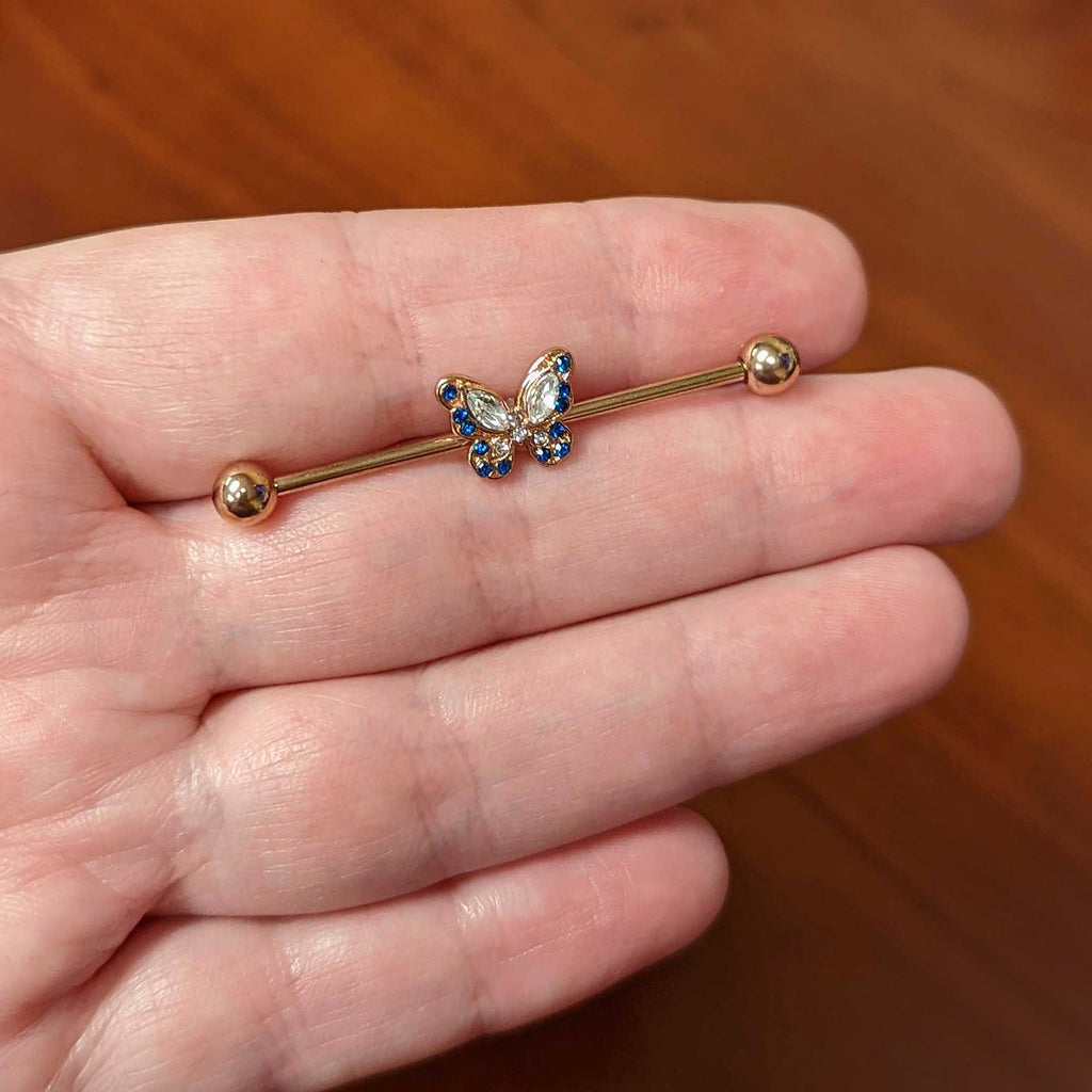 Fall in love with your industrial piercing when you're rocking this 14 gauge helix barbell! It's made with a 1 1/2" rose gold tone PVD over 316L surgical grade stainless steel straight barbell with 5mm ball ends. It features a butterfly charm. The butterfly features scalloped, textured wings, heavily embellished with clear and blue gems for a look that's irresistible. You can even slide it up and down the length of the barbell for the perfect look! This scalloped barbell earring is sure to have you swooning!Specifications