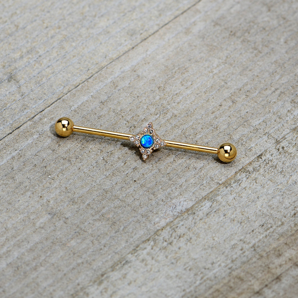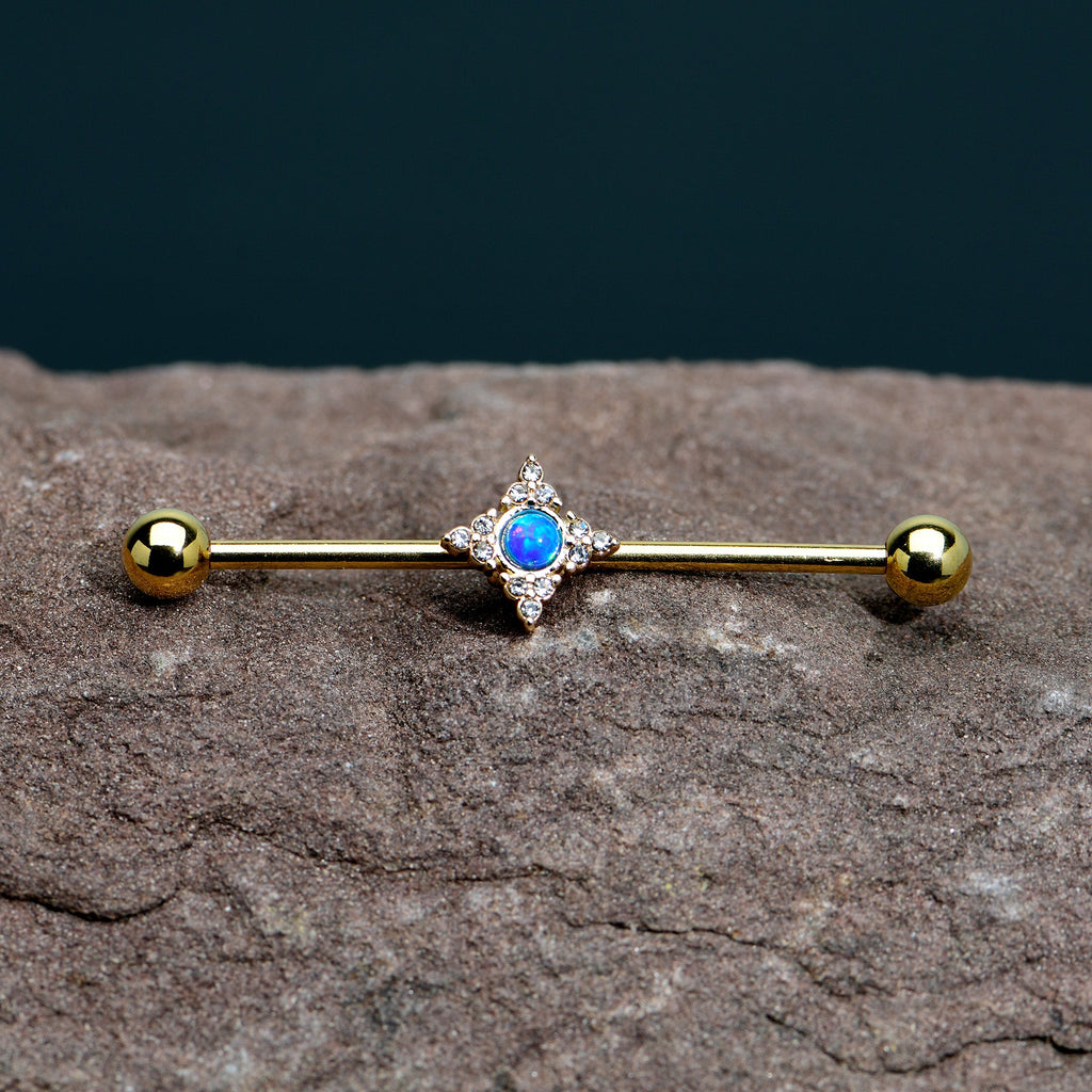 14 Gauge Blue Synthetic Opal Gold Tone Rhombus Industrial Barbell 38mm