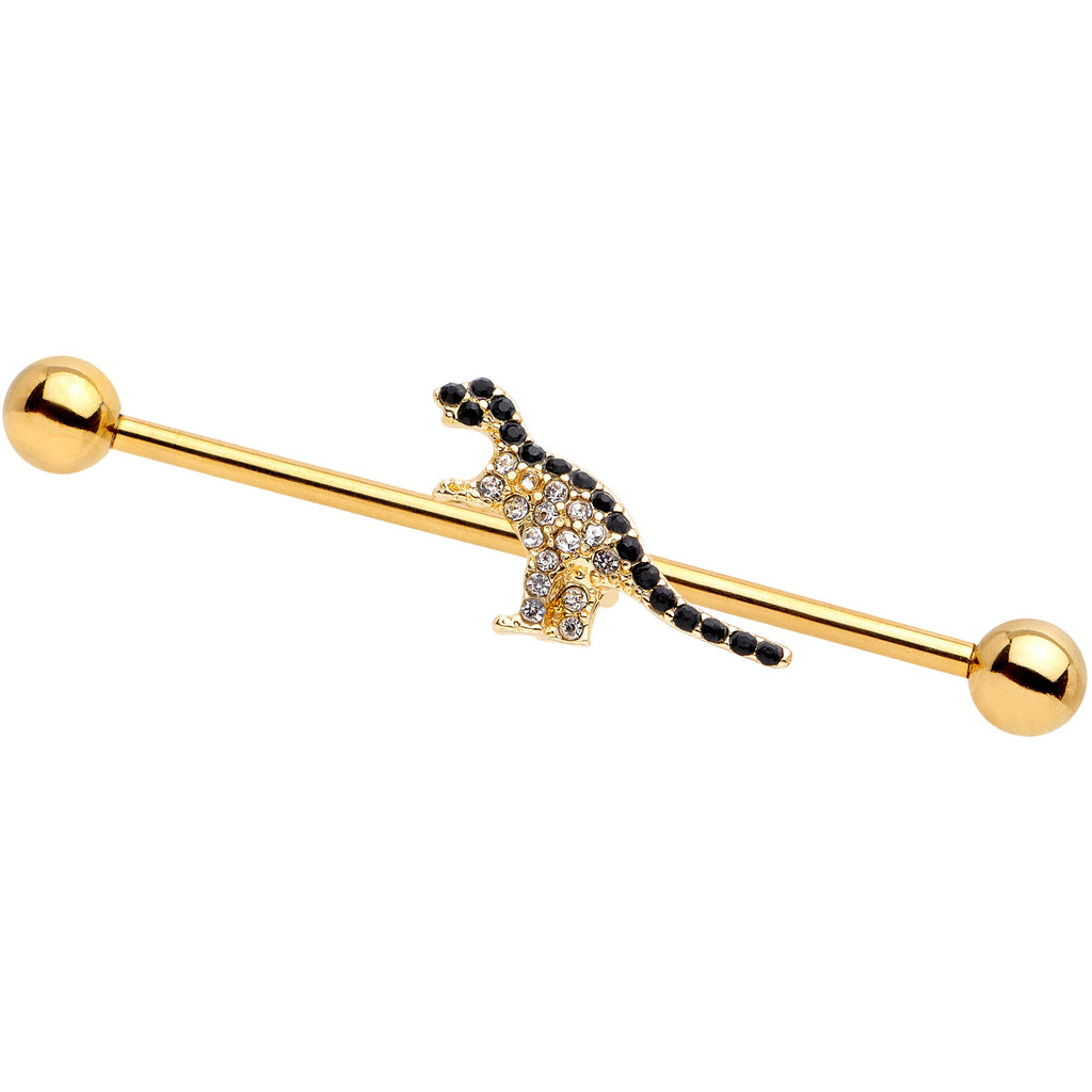 14 Gauge Clear Black Gem Gold Tone Dinosaur Industrial Barbell 38mm