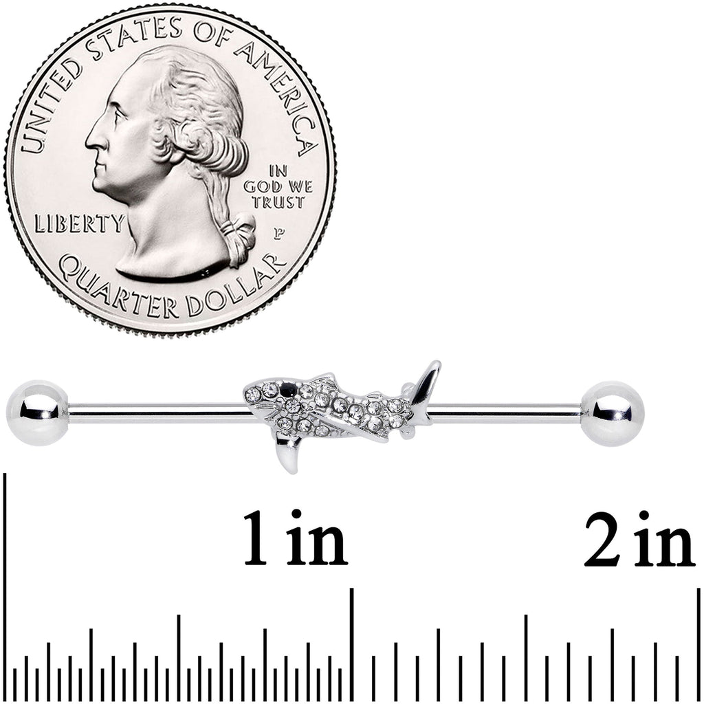 You've heard of having a bee in your bonnet.....but now you can have a shark in your ear with this 14 gauge helix barbell! It's made with a 1 1/2" durable 316L surgical grade stainless steel straight barbell with 5mm ball ends. It features a shark charm with set with clear gems and small black gem eye for an added touch of realism. This shark can swim up and down the length of the barbell to give you just the look you're after. Let this barbell earring take a bite out of your industrial piercing!Specifications