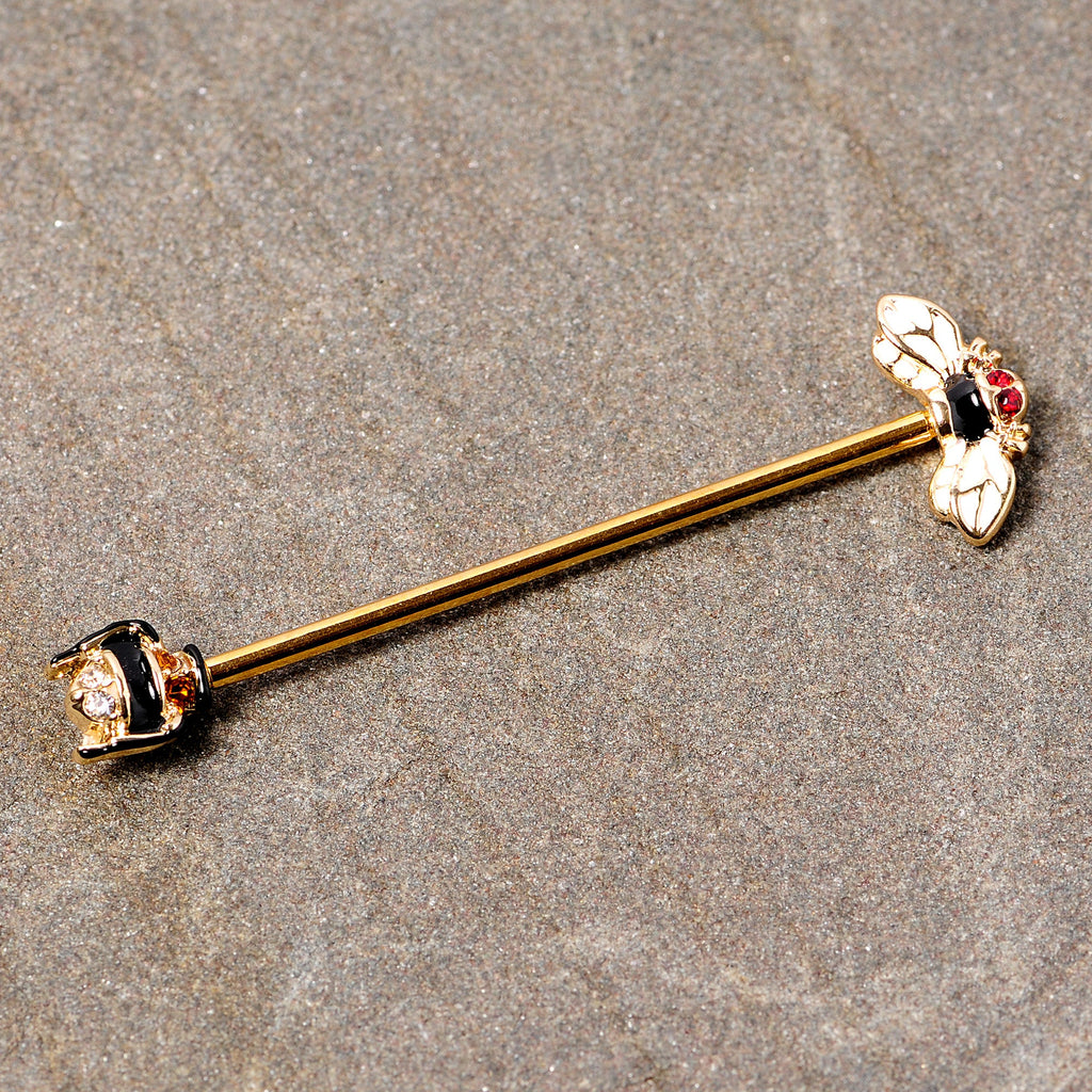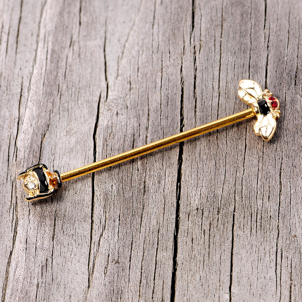 14G Clear Black Yellow Gem Gold Tone Bee Industrial Barbell 38mm