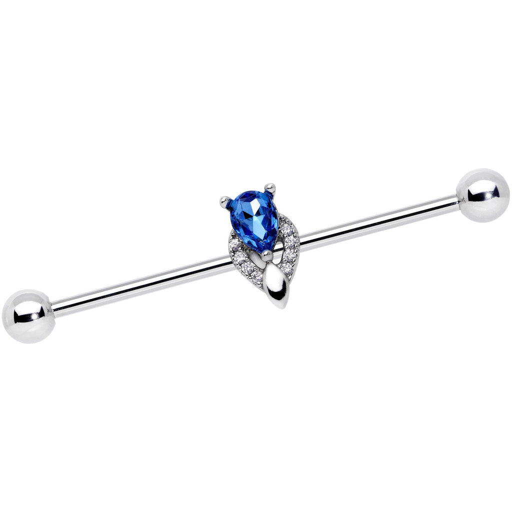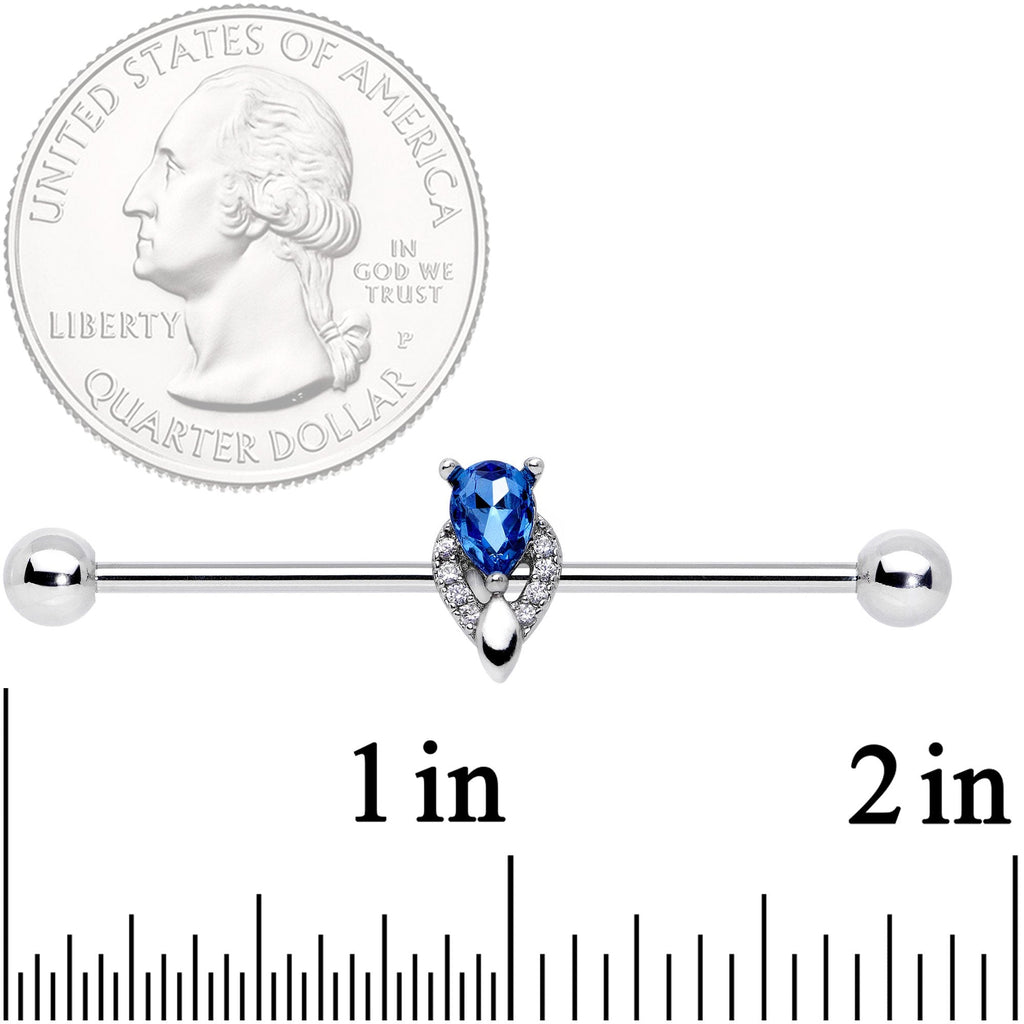 This 14 gauge industrial earring is bound to take you back in time! It's made with a 1 1/2" durable 316L surgical grade stainless steel straight barbell with 5mm ball ends. It features an Art Deco-inspired design of clear gems in a circular shape, meeting at the bottom to embrace a large blue gem, shaped like a drop that can be slid up and down the length of the barbell so you get just the look you want. You get all the glamour of an antique in a very modern piece of body jewelry!Specifications