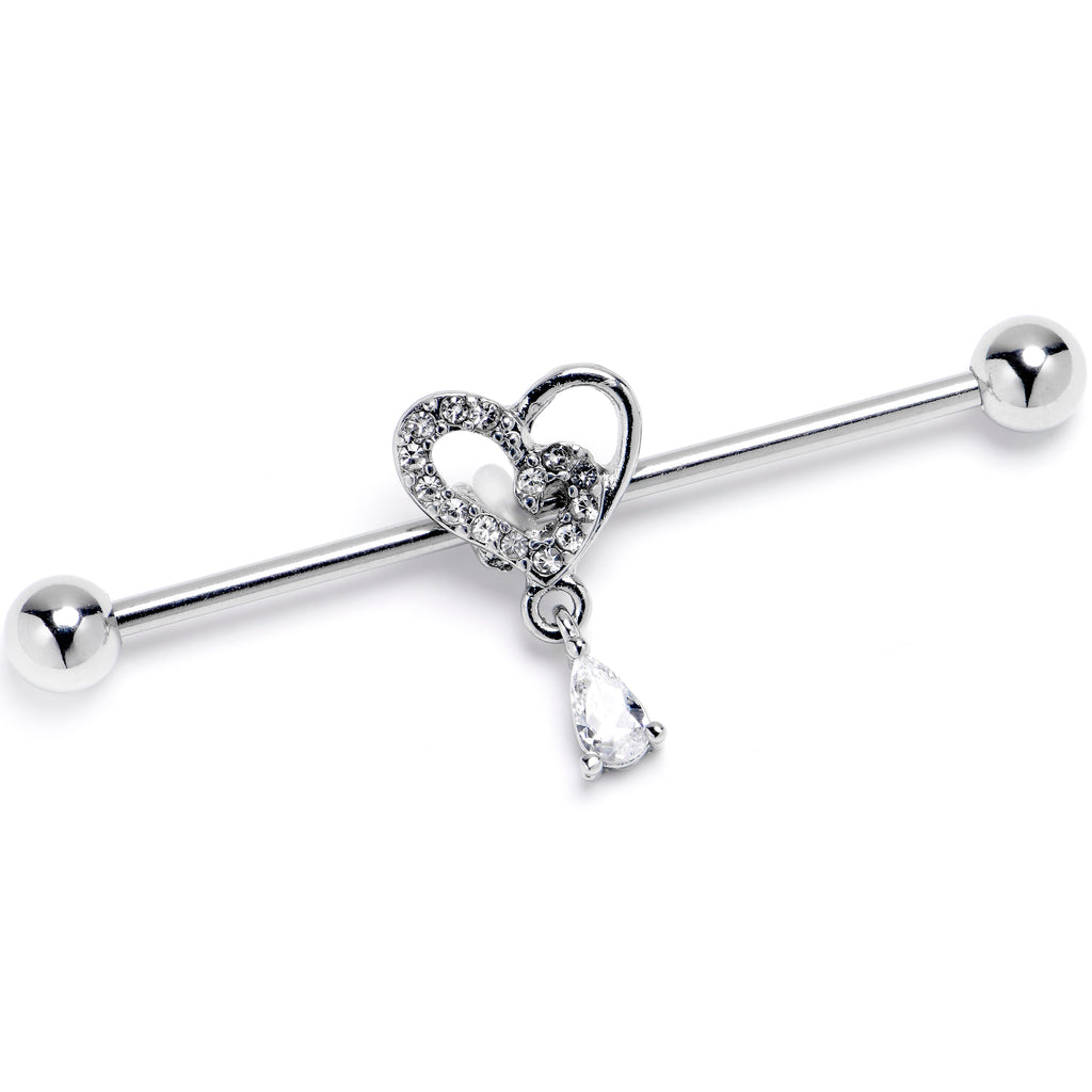 14 Gauge Clear CZ Gem Asymmetrical Heart Dangle Industrial Barbell 38mm