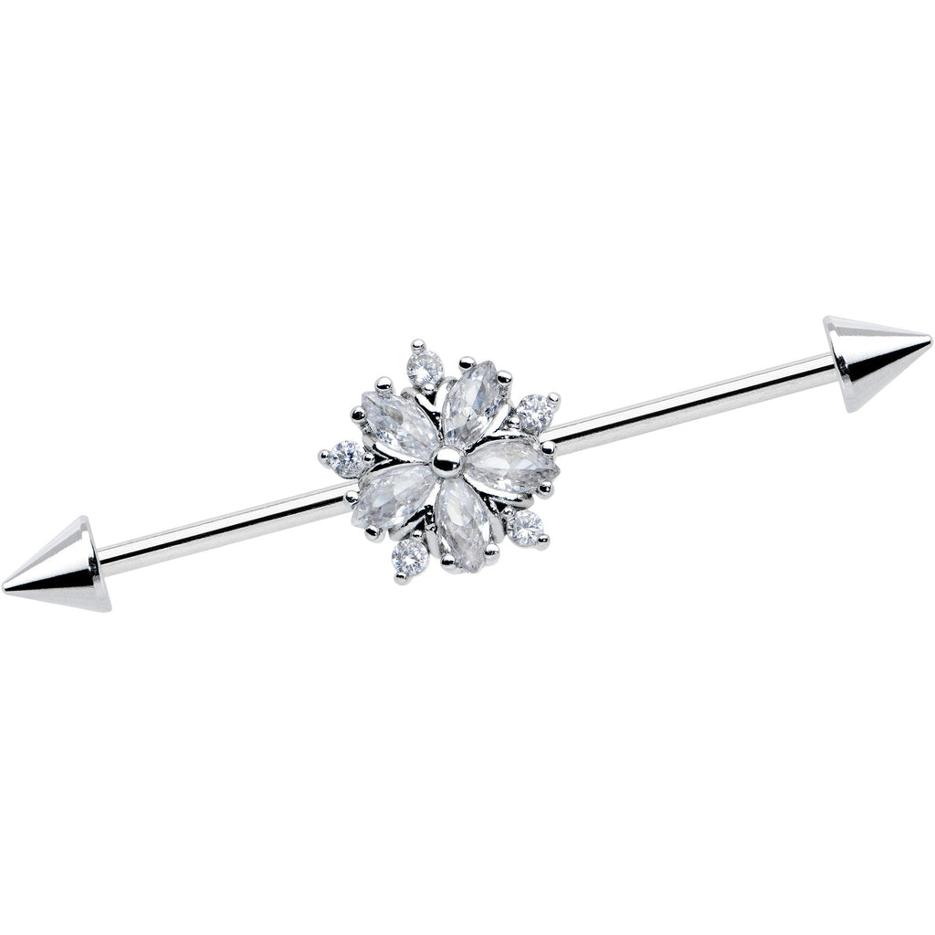 14 Gauge Clear CZ Gem Floral Burst Cone Ends Industrial Barbell 38mm