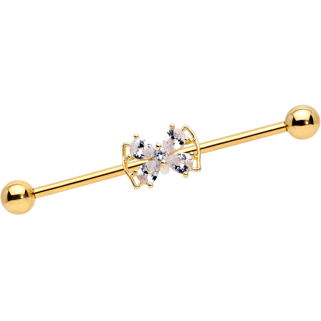 14 Gauge Clear CZ Gem Gold Tone Beauty Bow Industrial Barbell 38mm