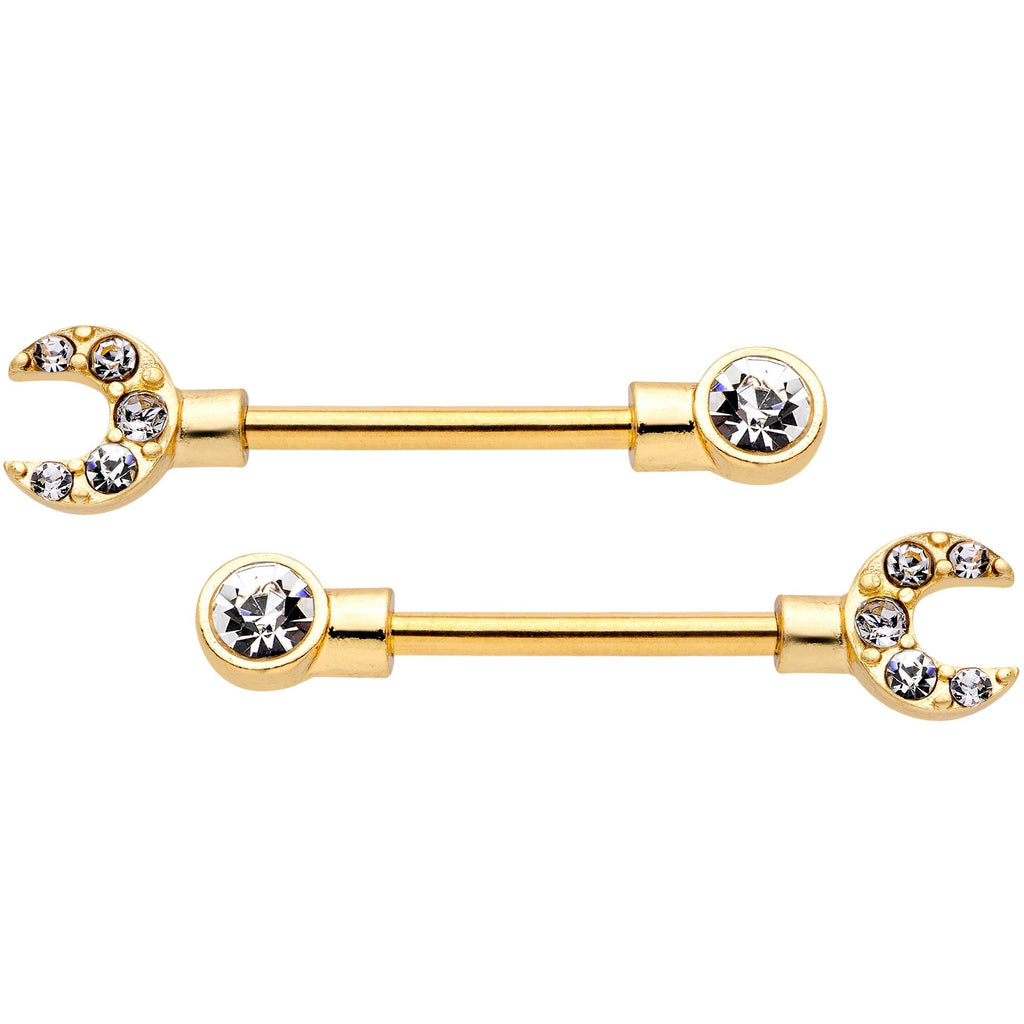 14G Clear CZ Gem Gold Tone Crescent Wrench Barbell Nipple Ring Set