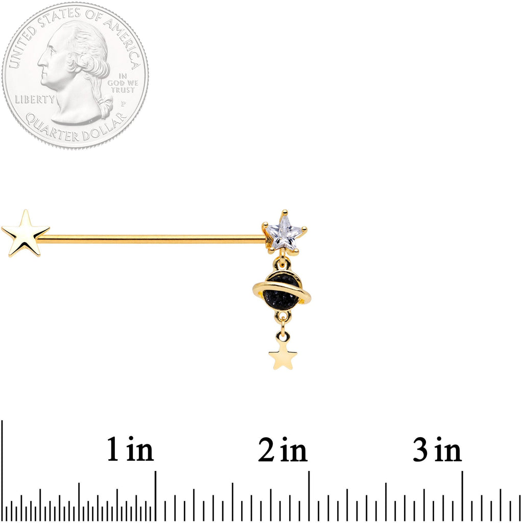 You've heard of having stars in your eyes....now you can have a whole solar system in your double helix piercing with this 14 gauge helix barbell! It's made with a 1 1/2" gold tone PVD over 316L surgical grade stainless steel barbell. One end is a star and the other is a star-shaped clear cubic zirconia gem. Dangling from the gem is a black planet Saturn dangle charm. Hanging from the base of the planet is a tiny gold tone star, giving the piece of a feel of continuity. This barbell earring is sure to be a "star" in your body jewelry wardrobe!