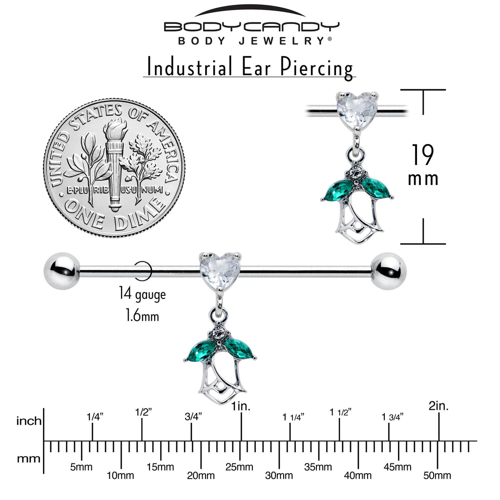 14 Gauge Clear CZ Gem Heart And Rose Dangle Industrial Barbell 38mm