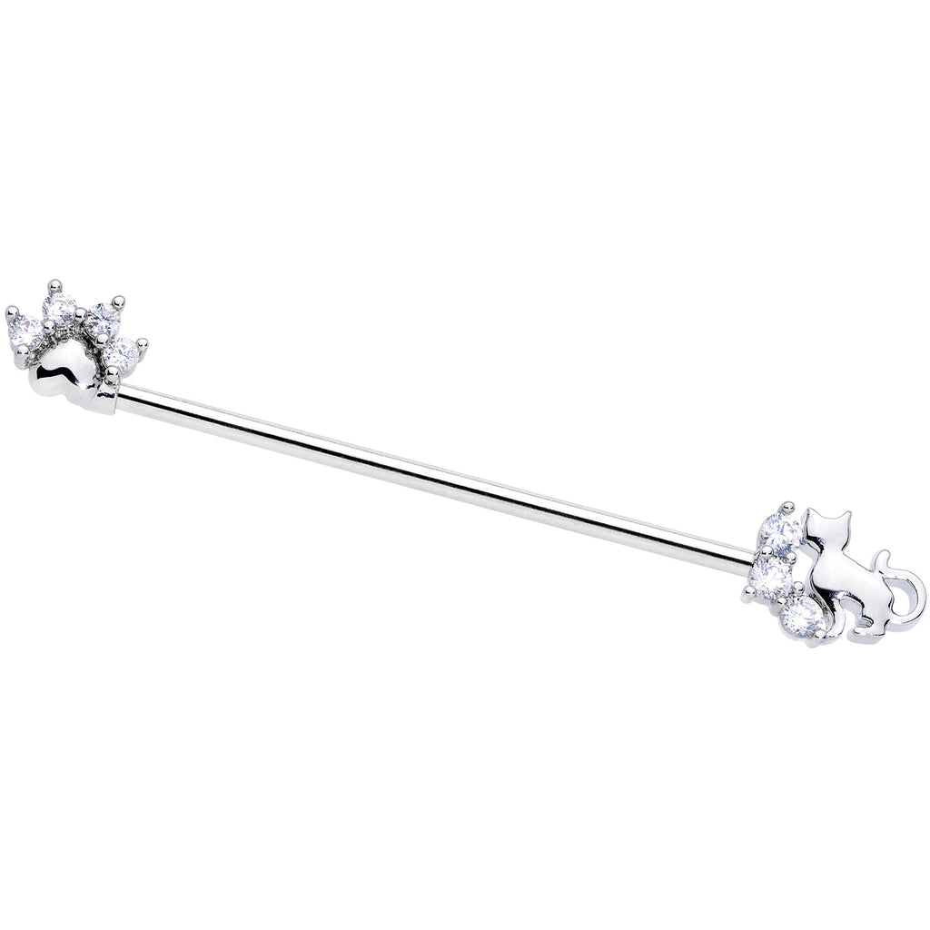 14 Gauge Clear CZ Gem Paw Print Cat Industrial Barbell 38mm