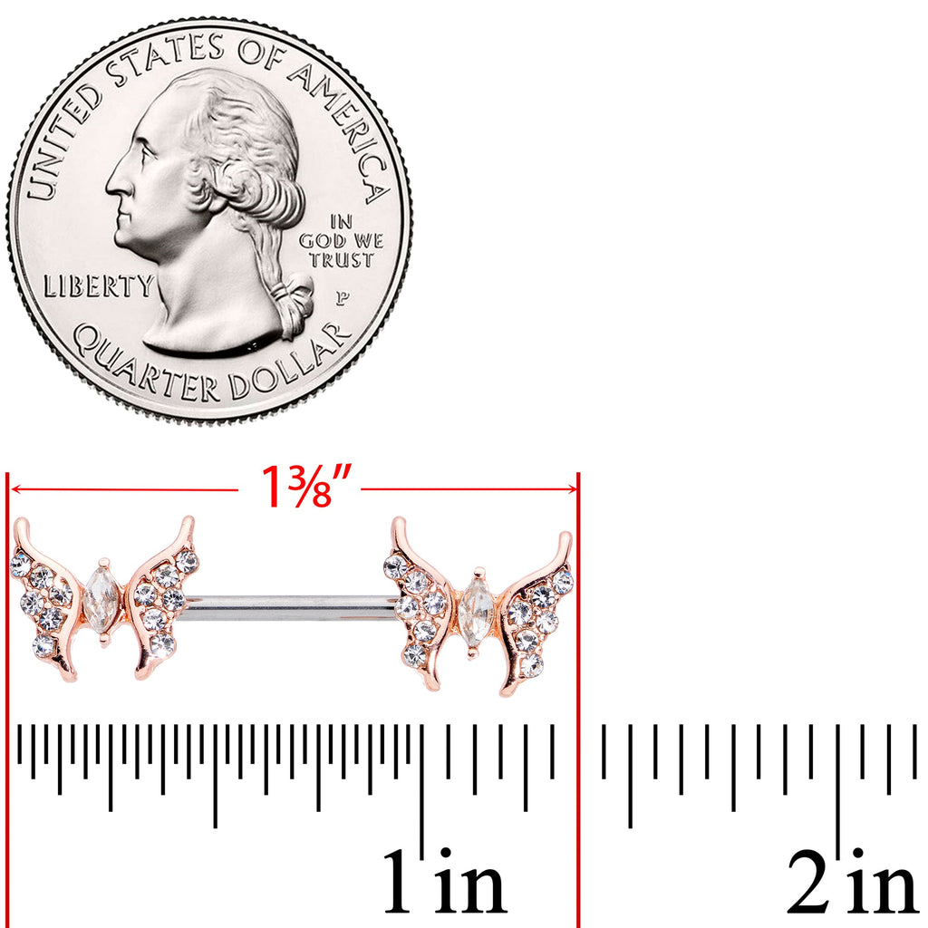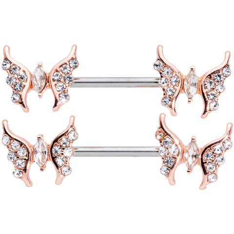 14 Gauge Clear CZ Gem Rose Gold Hue Drama Butterfly Barbell Nipple Ring Set