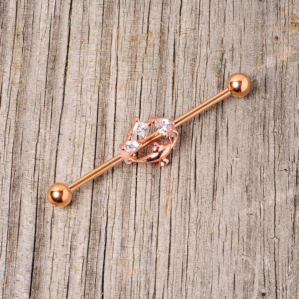 If you've been wishing for something new to put in your industrial piercing, your wish has been answered with this 14 gauge helix barbell! It's made with a 1 1/2" rose gold tone PVD over 316L surgical grade stainless steel straight barbell with 5mm ball ends. It features a genie's lamp charm of a with three clear cubic zirconia gems to represent smoke coming out from the spout. And this charm can be slid up and down the length of the barbell industrial so you get just the look you're after. What more could you possibly wish for?Specifications