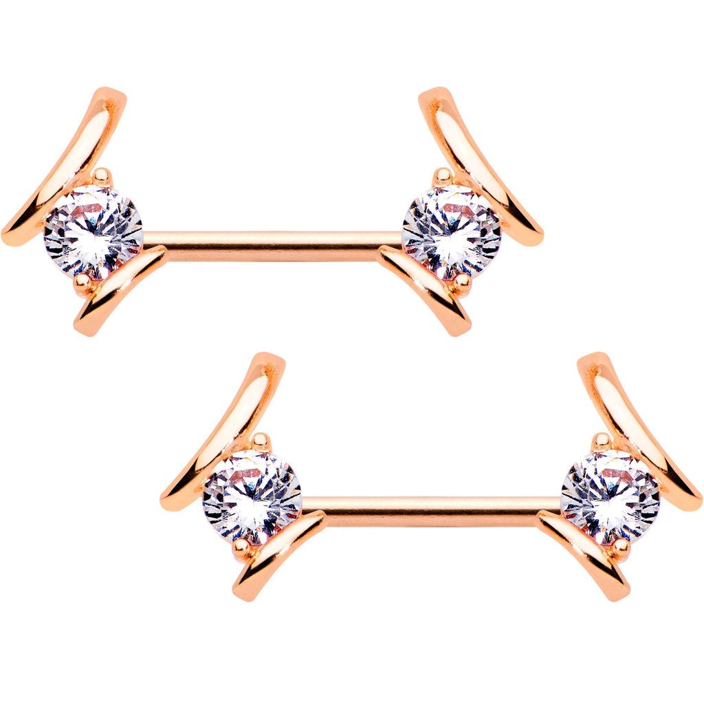This fun set of nipple BCR captive rings and straight barbell nipple rings gives you a lot of options. Wear the matching set of captive rings, the matching set of barbells, or mix them up! The 14 gauge captive nipple rings are 9/16" in length are made with rose gold PVD over 316L surgical grade stainless steel. The 9/16" straight barbells are also 14 gauge, feature clear cubic zirconia front facing gems mounted on stylish flair metalwork design, and are made with rose gold PVD over 316L surgical grade stainless steel. Sold as a set of four.