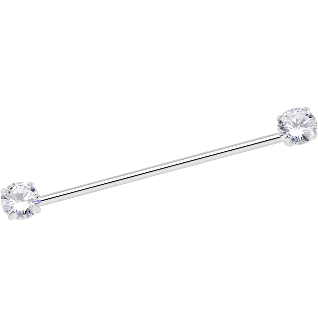 Add some sexy sophistication to your industrial piercing with this 14 gauge helix barbell! It's made with a 1 1/2" durable 316L surgical grade stainless steel straight barbell. The charm ends are threadless round clear cubic zirconia gems made to make insertion and removal a breeze while still offering a secure fit. With their easy elegance and uncomplicated sophistication, this barbell earring really does have it all!Specifications
