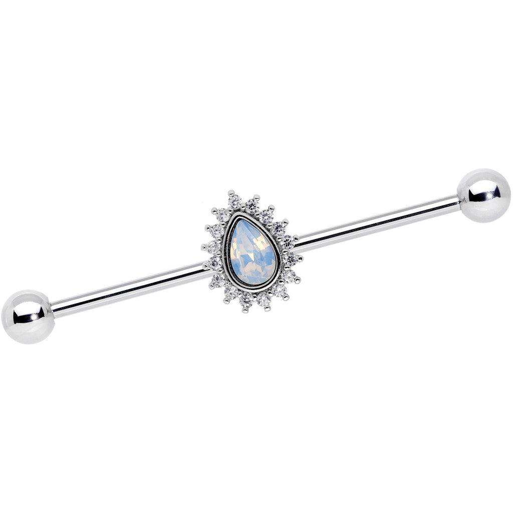 This 14 gauge industrial earring will leave you nothing to cry about! Made with a 1 1/2" durable 316L surgical grade stainless steel straight barbell, it has 5mm ball ends. It features a charm of a white faux opal, surrounded by a halo of clear cubic zirconia gems for a look of icy regal luxury. The charm is moveable and can be slid up and down the length of the barbell so you can get just the look you want. This piece is so lovely, you'll be a bit misty-eyed with happiness!