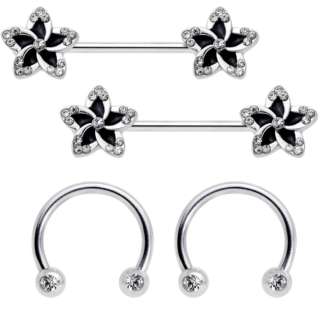14 Gauge Clear Gem Black Flower Horseshoe Barbell Nipple Ring Set of 4