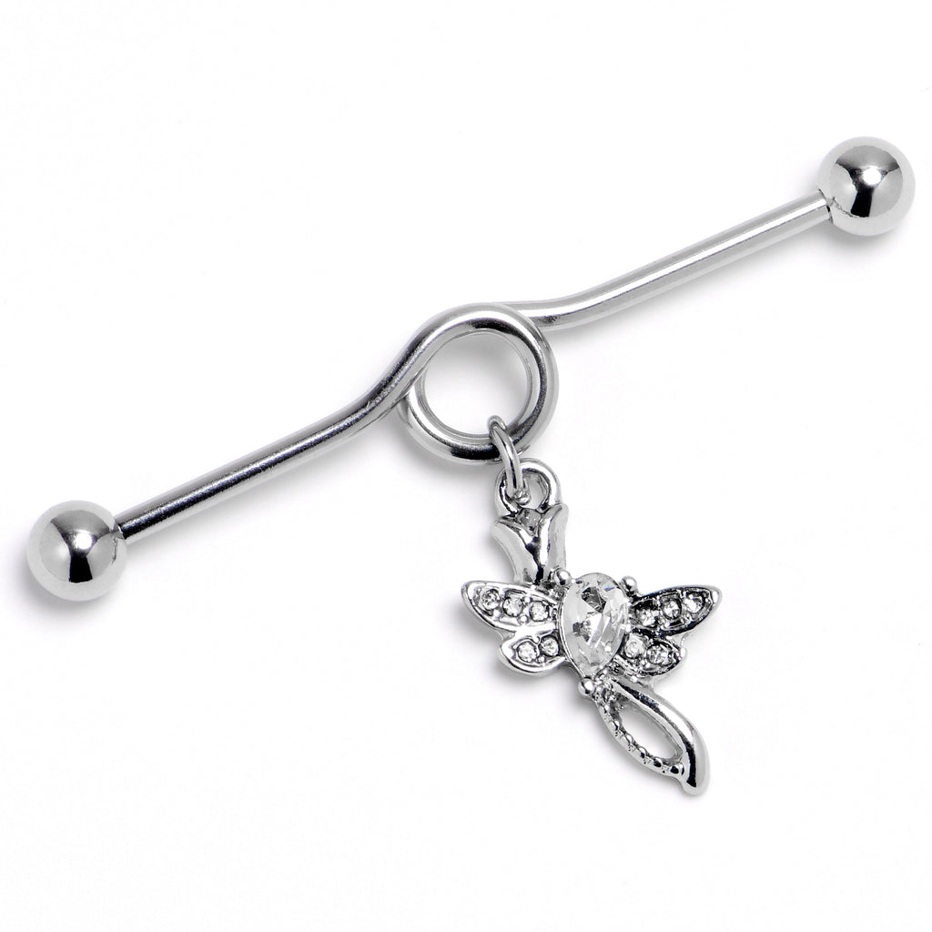 Dragonflies are constantly on the move so sometimes they just want to hang out. This 14 gauge helix barbell is made with a 1 1/2 inch durable 316L surgical grade stainless steel project bar with 5mm ball ends. The barbell portion features a loop in the center. Dangling from it is an ornate dragonfly charm, with the wings set with clear gems. The dragonflys body is set with a clear gem for a look that is both fashion forward and stylish. You will want to hang out with this dragonfly barbell earring all the time.Specifications