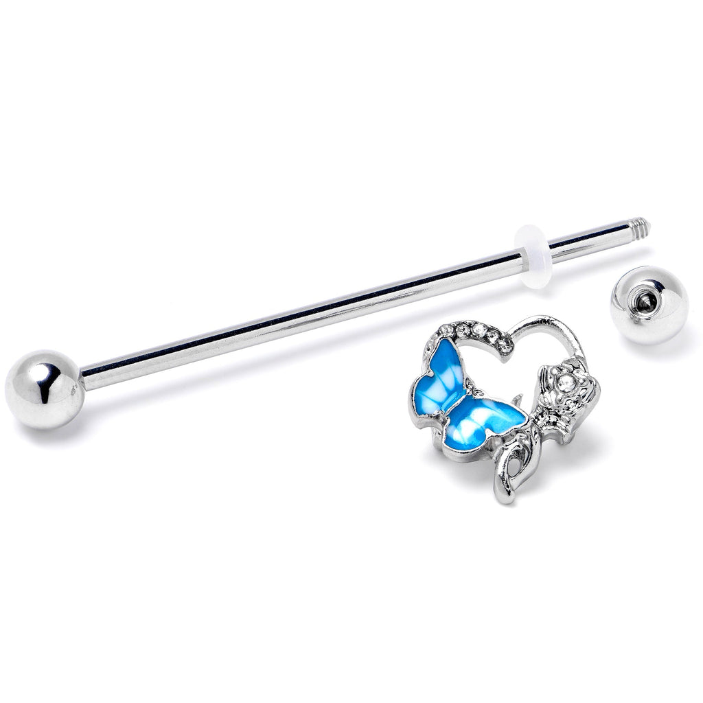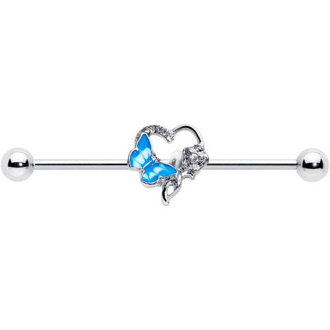 14 Gauge Clear Gem Butterfly Flower Blue Industrial Barbell 38mm