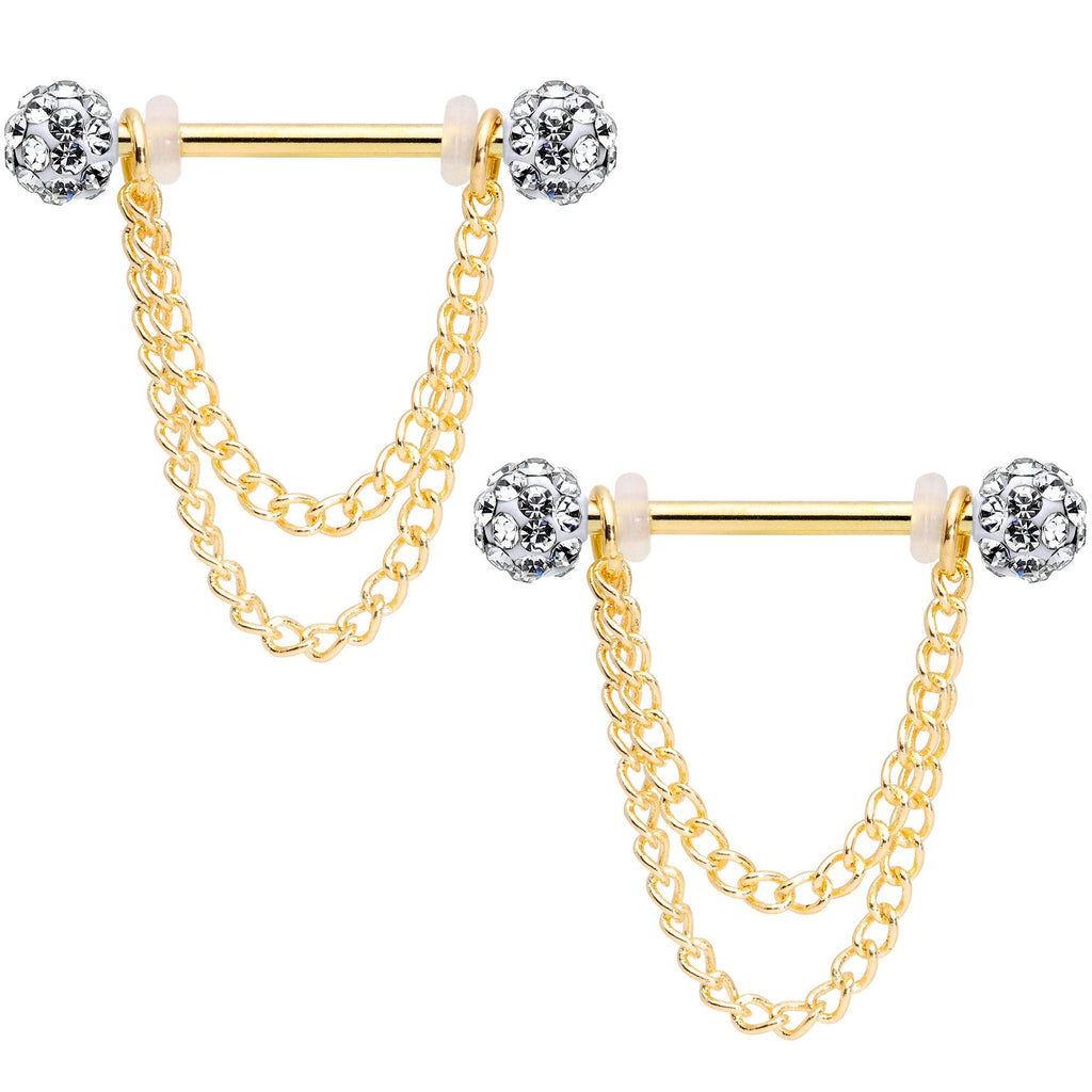Don't look now but if you want your breasts to look their best this pair of 14 gauge nipple jewelry is just right! Made with 5/8" gold tone plated over 316L surgical grade stainless steel straight barbells, these nipple piercings feature clear gem paved ball ends and sexy double chain dangles for eye-catching movement. Sold as a set of two.Specifications